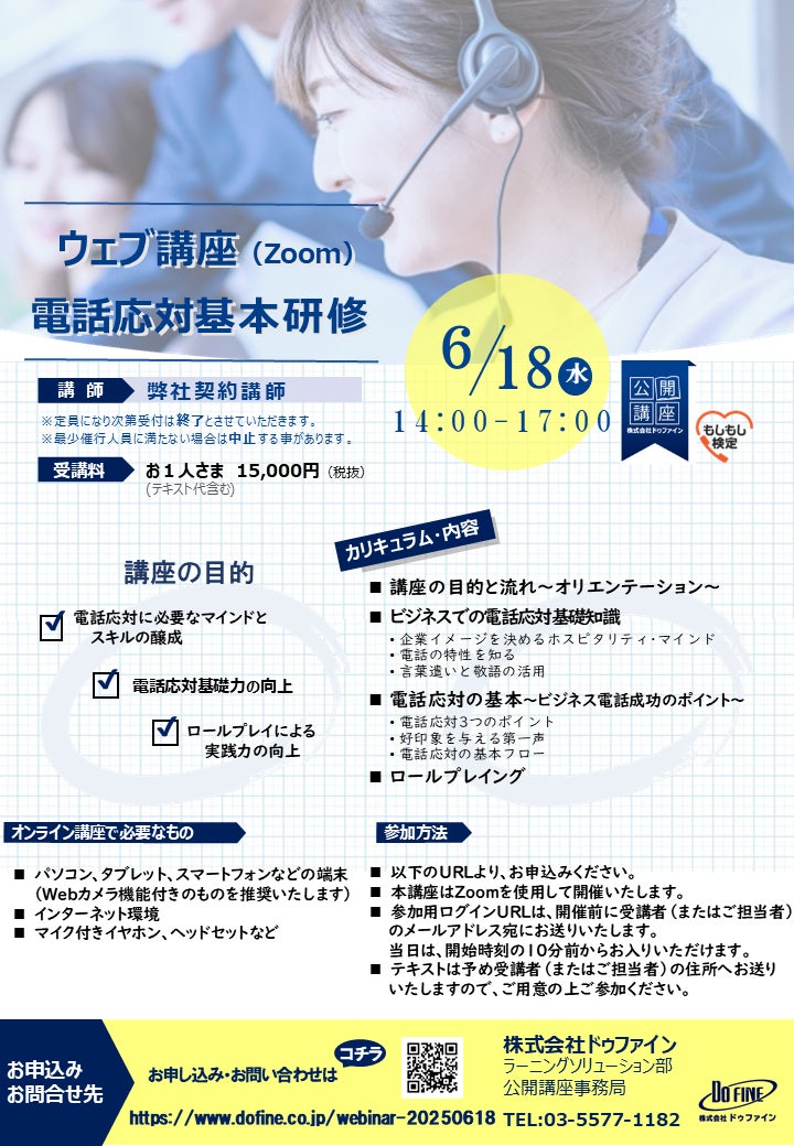 株式会社ドゥファイン(本社:東京都千代田区神田猿楽町2-7-6 TK猿楽町ビル3F、代表取締役社長:恩田謙太郎)は、2025年6月18日(水)にウェブ講座「電話応対基本研修」を開催します。