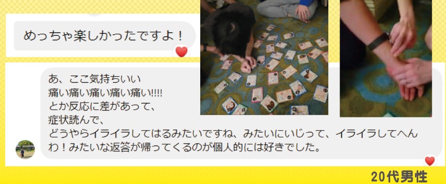 当初40代以上の方々を対象としていた『ツボかるた』ですが、20代のグループに試用してもらったところ、予想を超える好反応がありました。若者たちは、ゲームを通じて自然とコミュニケーションを取り、お互いの体調や気分について語り合う姿が見られました。