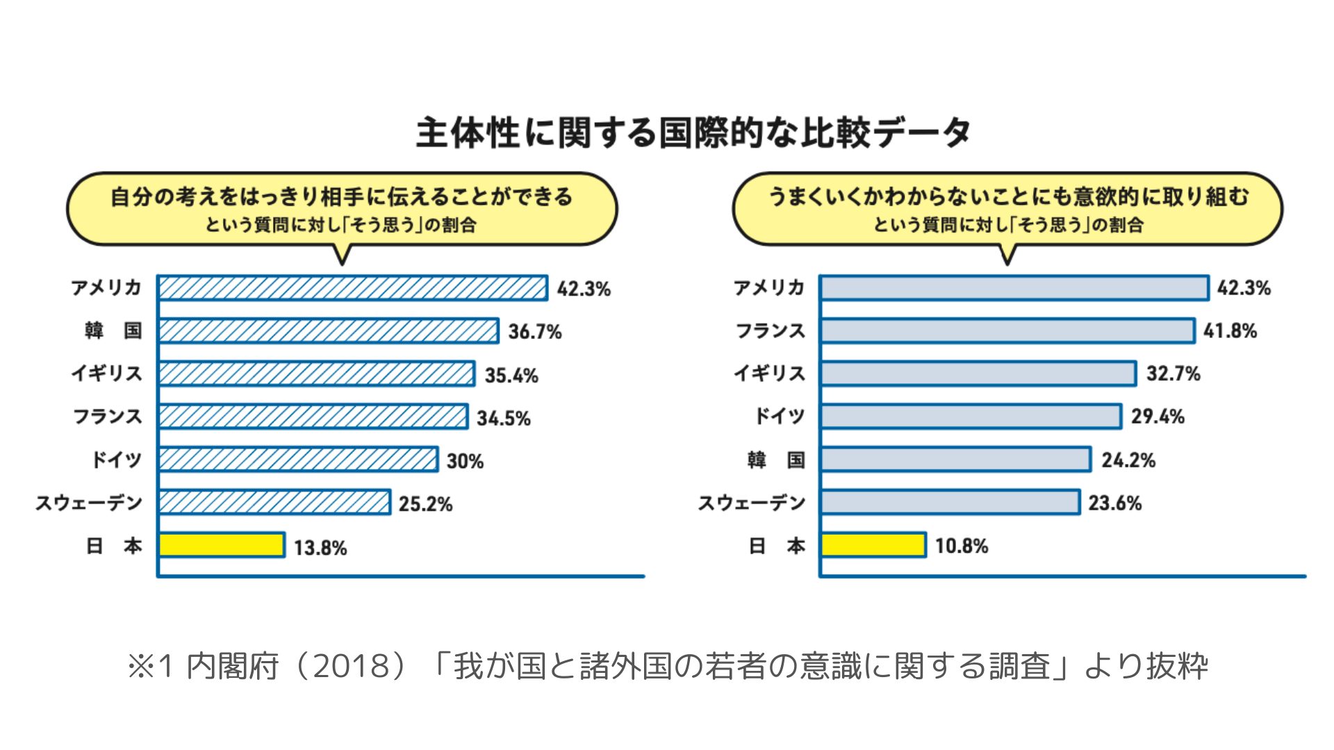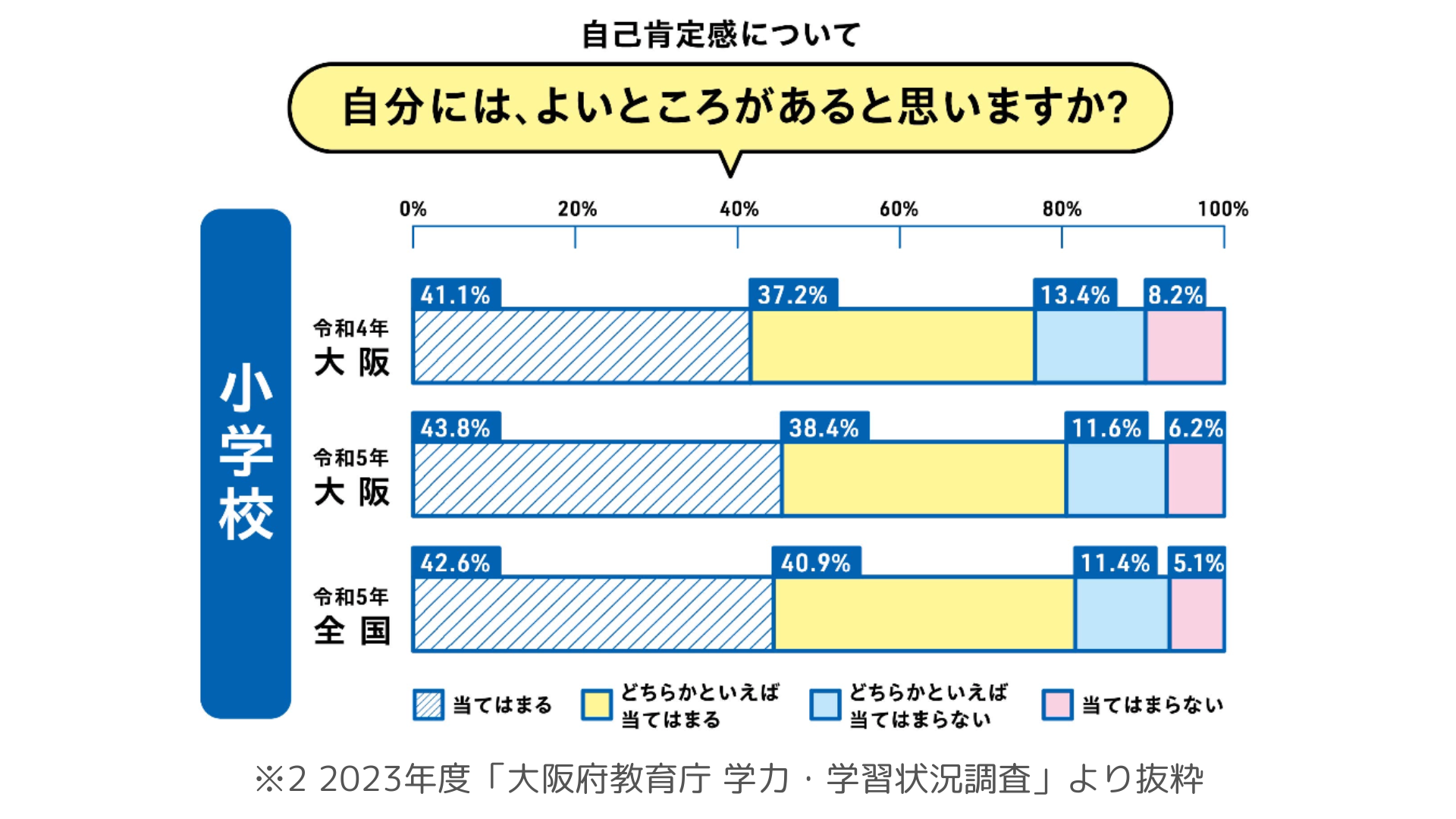 現在、日本の子どもたちは自分の意見を伝える力や未知に挑む意欲が他国と比べて低いという調査結果があります(※1)。特に大阪においては、自己肯定感が全国平均を下回る子どもが多く(※2)、地域の教育や支援が求められています。このような現状を受け、「こども万博2024 in 大阪」は、子どもたちに自信を持たせ、未来への希望を抱かせることで、これらの課題の解決を図ることを目的としています。