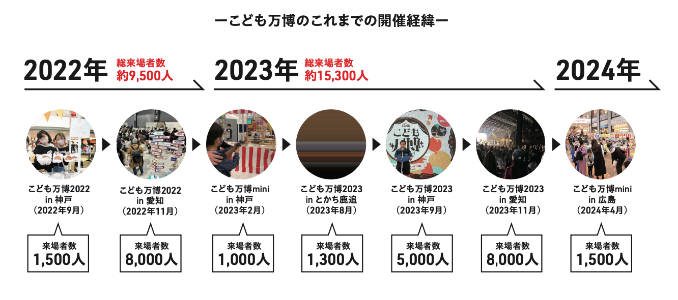 2022年、コロナ禍により子どもたちの行動が制限される中、こども万博実行委員会の委員長 手塚麻里が自宅の1室で12人の子どもと描いた128個の夢からこのイベントは始まりました。その後、神戸や愛知、北海道、広島などで累計7会場で開催し、約3万人を動員。2024年は7都市(広島・大阪・愛知・神戸・静岡・北海道・横浜)での開催を予定しています。