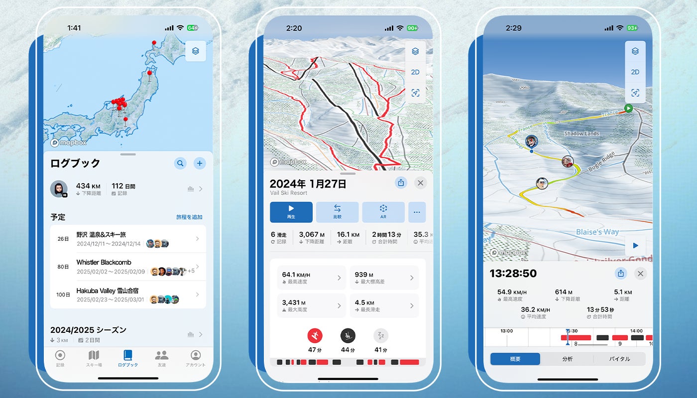 友達と位置情報共有、スキー場の情報、雪質へのフィードバック、無制限の滑走記録、主要な統計&概要、シーズンごと&全シーズンの統計、Siri、HealthKit、Health Connectとの連携など