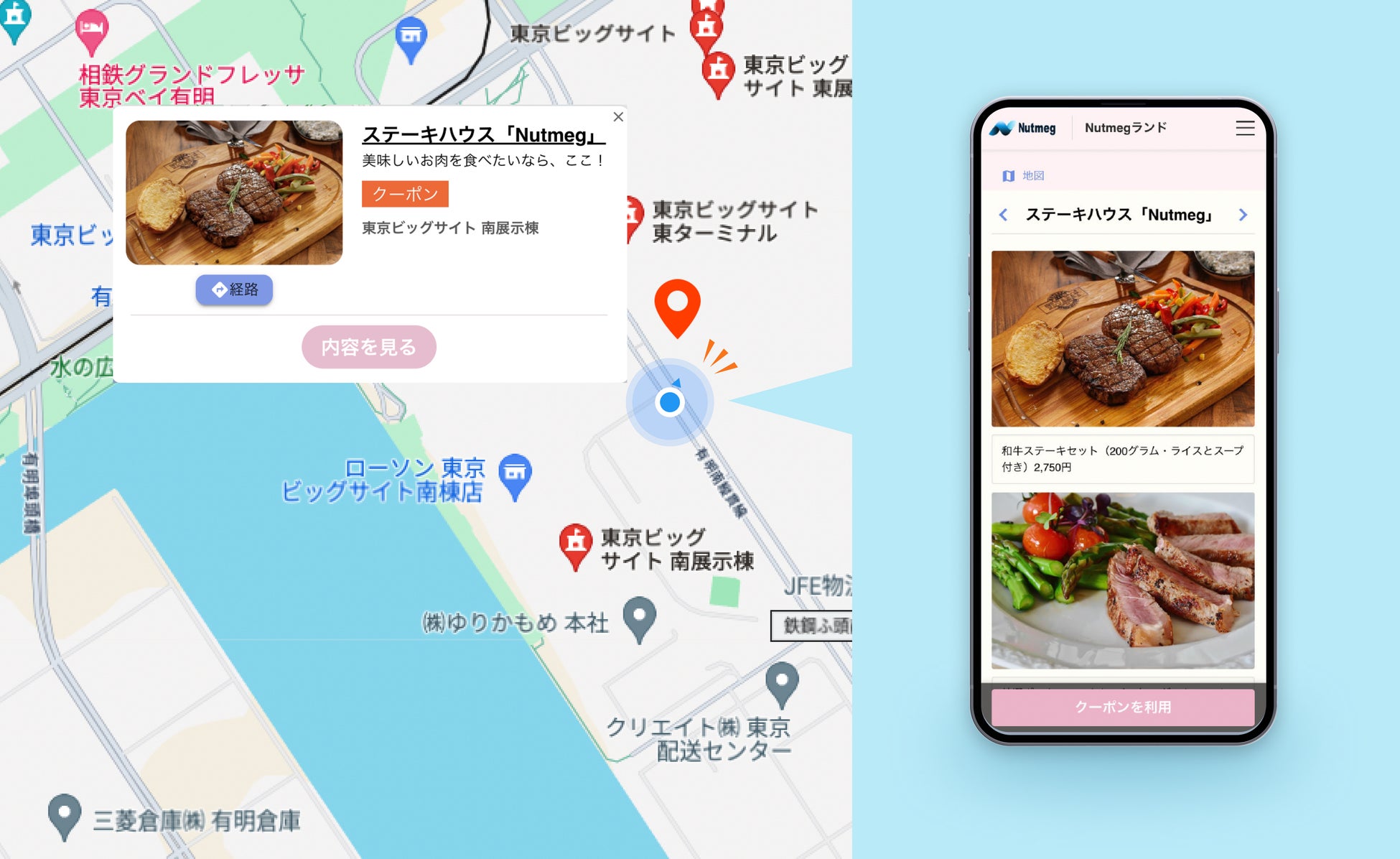 位置情報を登録することでGoogleマップと連動した独自のマップ上に施設の案内を表示させることができ、スマホのGPSと連動することでマップの利用中は直感的に目的地の場所や距離が分かります。また、位置情報と連動可能なクーポン機能と合わせて利用することで、施設の利用促進にも繋がります。
