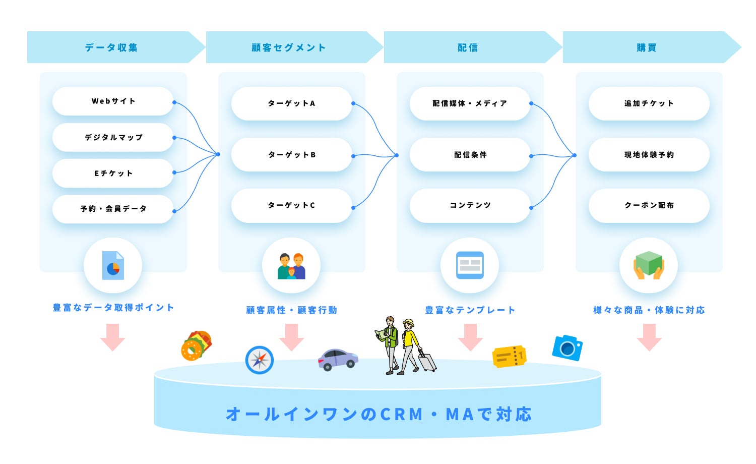 当社は継続的にCRM・MAを強化し、タビナカに特化したCDP※の提供やデータを活かしたパーソナライズコンテンツの配信ができるバージョンへの進化を予定しています。タビナカにおけるあらゆる商品をアップセル・クロスセルすることが可能となり、観光事業者の収益最大化に貢献できるワンストップサービスを目指してまいります。観光DXを促進し、タビナカ体験の向上をサポートすることで、観光業界の活性化に貢献します。