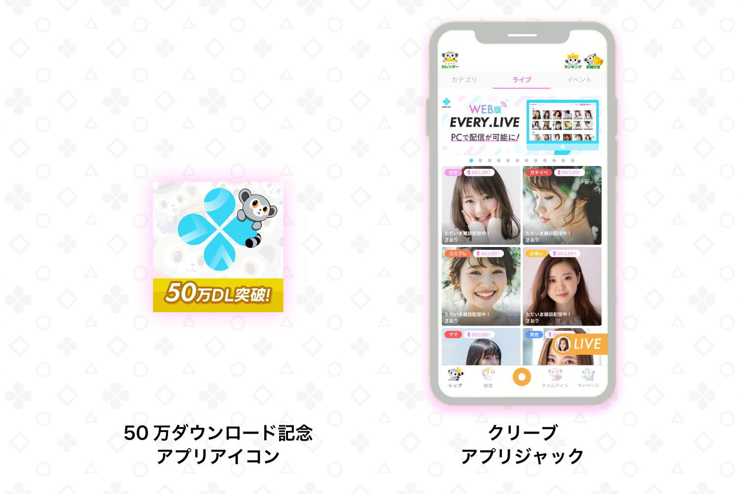 また、everylive公式キャラクターエブリフレンズのクリーブによるアプリジャックを同時展開いたします。