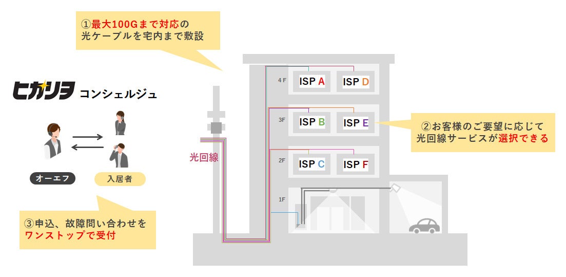 また、入居者からの「光回線は引けるか?」「どこのキャリアの光回線が引けるか?」などといった問い合わせについては、「ヒカリヲコンシェルジュ」が管理会社に代わって全て対応。希望者は専用のホームページから回線サービスの申込みや切り替えが出来るようになり、開通後のサポートもヒカリヲコンシェルジュが行うため、管理会社の手を煩わせません。