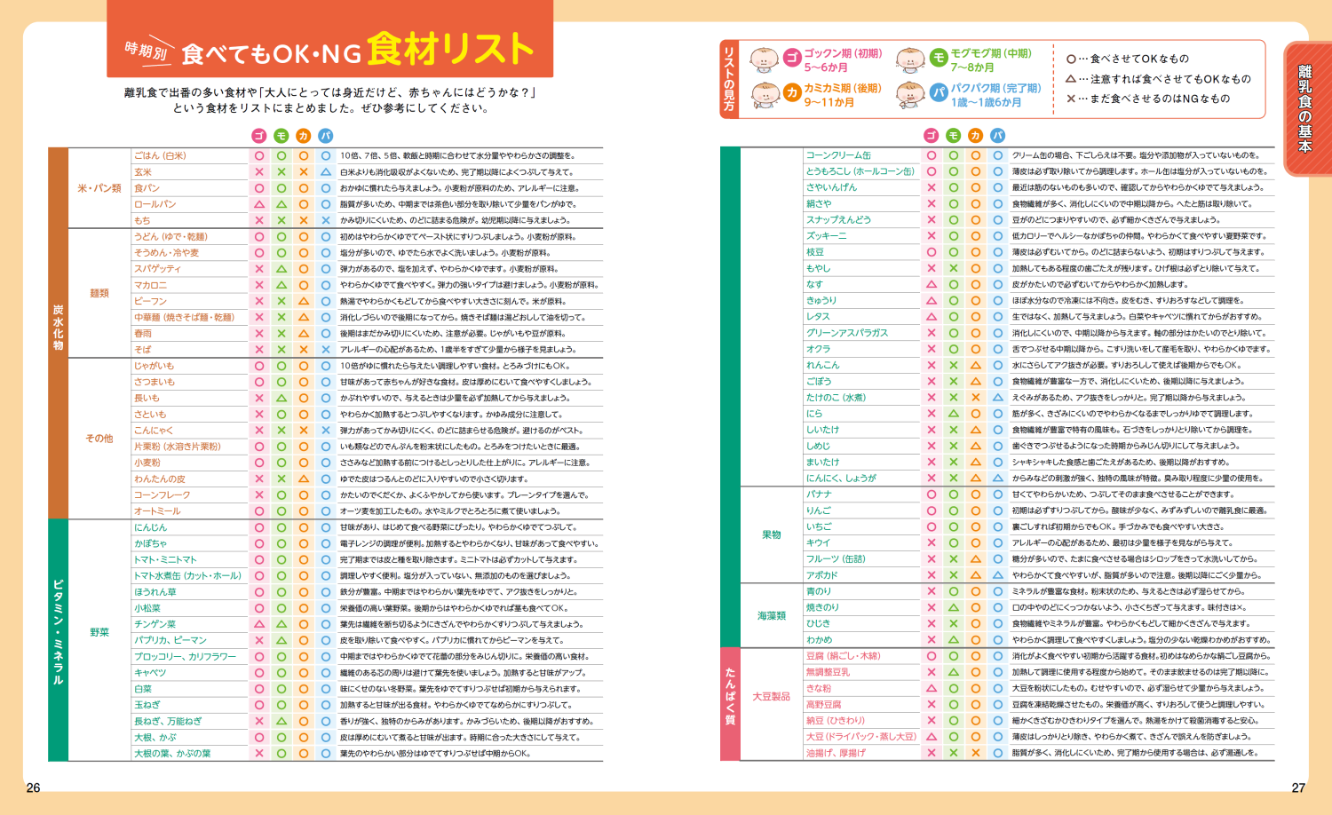 本書では離乳食を食べる時期に与えてOK(NG)な食材が一目でわかるリストを掲載しています。