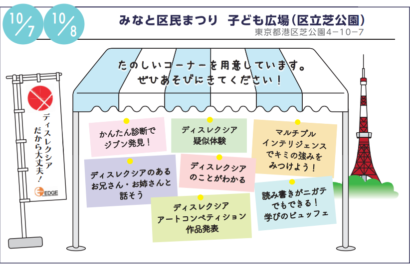 子ども広場ブース7に、たのしいコーナーを用意しています。ディスレクシアのあるお兄さん・お姉さん、おとなのひとと話せる時間もあります。みなと区民でなくてもだれでも入れますので、ぜひあそびにきてください!ブースに来てくださったお子さんにシールの景品、イベント参加者にはポストカードなどの特典もあります。