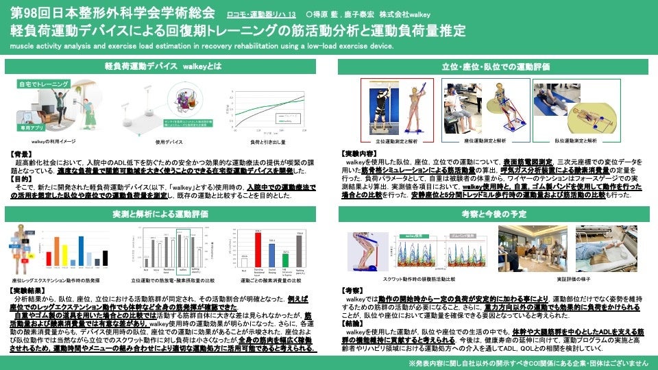 株式会社walkey(本社:東京都目黒区、代表取締役社長:渡辺 達哉)は、第98回日本整形外科学会学術総会において、当社のリハビリマシン「walkey device」を活用した最新の研究成果を発表するとともに、企業展示ブースに出展いたしました。整形外科の開業医・クリニックの皆様に向け、運動療法の現場での新たな選択肢をご提案いたします。