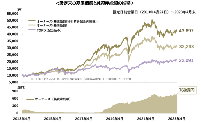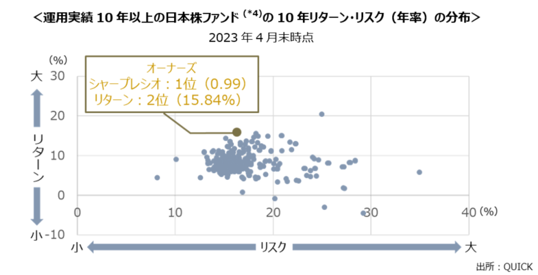 個人投資家の皆さまからご支持をいただき、オーナーズの基準価額は設定来で4倍超に成長し、純資産総額は約768億円となりました(2023年4月末時点)。また、運用実績10年以上の日本株ファンド(*1)(2023年4月末時点)の中では、10年間のシャープレシオ(*2)が0.99と、運用効率の面ではトップの成績となっています。
