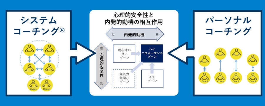「BestTeam」は、コーチングをベースとして、個人の内発的動機の開発と、チーム(組織)の心理的安全性環境の開発を実際の業務に関連付けて相互に高めることで、個人以上の能力を発揮するチームへの「ハイパフォーマンスゾーン」コンディションをつくります。
