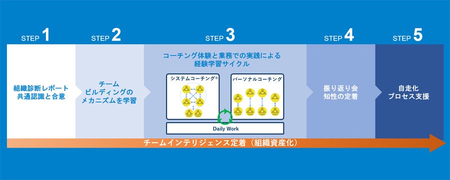 対話をベースとしながら個々とチームの経験と内省のサイクルを深めることで、チーム全体の成長に向けて本質的変化を促し、実務環境での実践によってチームインテリジェンス(知性)が組織に定着していきます。