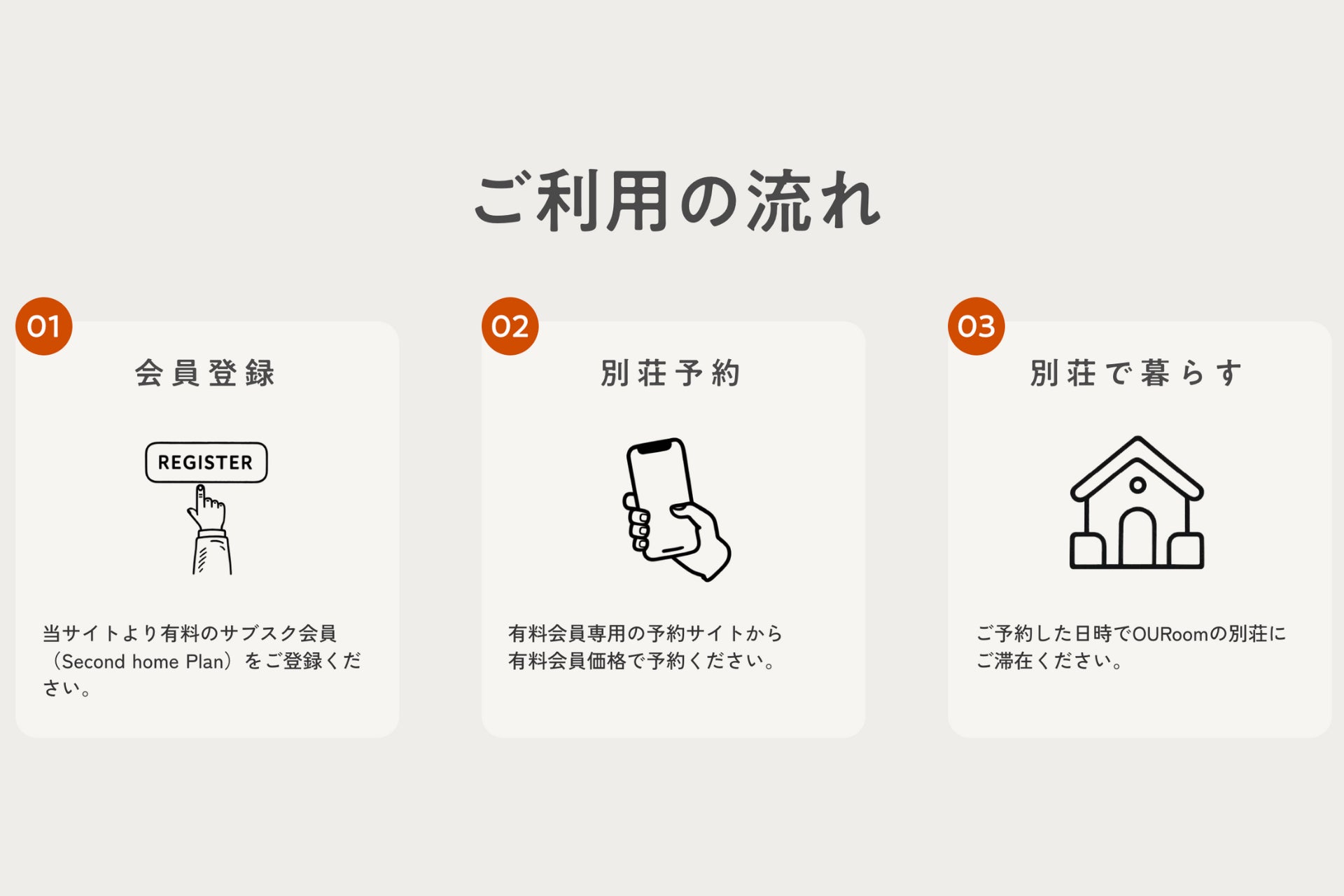 また、ご利用いただく別荘は、OURoomが管理をするため、家具や家電の手配、清掃やアメニティの補充などの維持・管理の手間は必要ありません。チェックイン/アウトや利用案内の確認も全てスマホで完結します。ノンストレスでスマートに別荘暮らしをすぐに始めることができます。