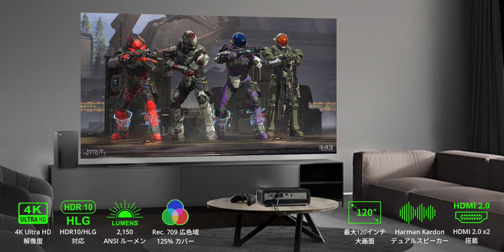 X2-4Kの外観はXBOXのイメージカラーを採用しました。 ブラックの本体色とグリーンの仕上げにより従来的なプロジェクターと異なり、ゲーミング要素と雰囲気を演出します。画像パフォーマンスの方が、ViewSonic独自のCinema SuperColor+™テクノロジーにより、X2-4Kは2,900 LEDルーメンの明るさを実現しながら、Rec.709色域の125%をカバーします。さらにHDR10とHLGも対応するため、やや明るい環境で 使用しても鮮やかでダイナミックな映像表現を楽しむことができ、明るい環境ではコントローラーの視認性も強化されたため、RPGやFPS、スポーツなどのゲーム機体験も満喫できます。X2-4Kは第3世代LED光源を搭載しており、水銀不使用で環境にやさしく、 最大30,000時間の長寿命を実現したため 、長期間使用しても減衰のない映画館体験を楽しむことができます。