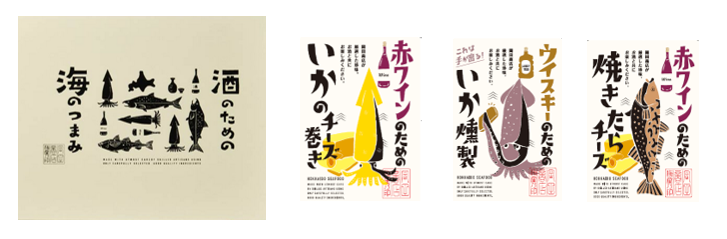 いままでのおつまみのイメージを一新する、カジュアルでかわいらしいイラストを使用し女性でも手に取りやすいパッケージ、サイズにしました。また「酒のための海のつまみ」のロゴ入りの化粧箱もご用意しましたので、お好きな組み合わせでギフトとしてのご利用にも最適です。おつまみの日本風のイメージも取り入れましたので海外の方のお土産等にもぜひご利用ください。