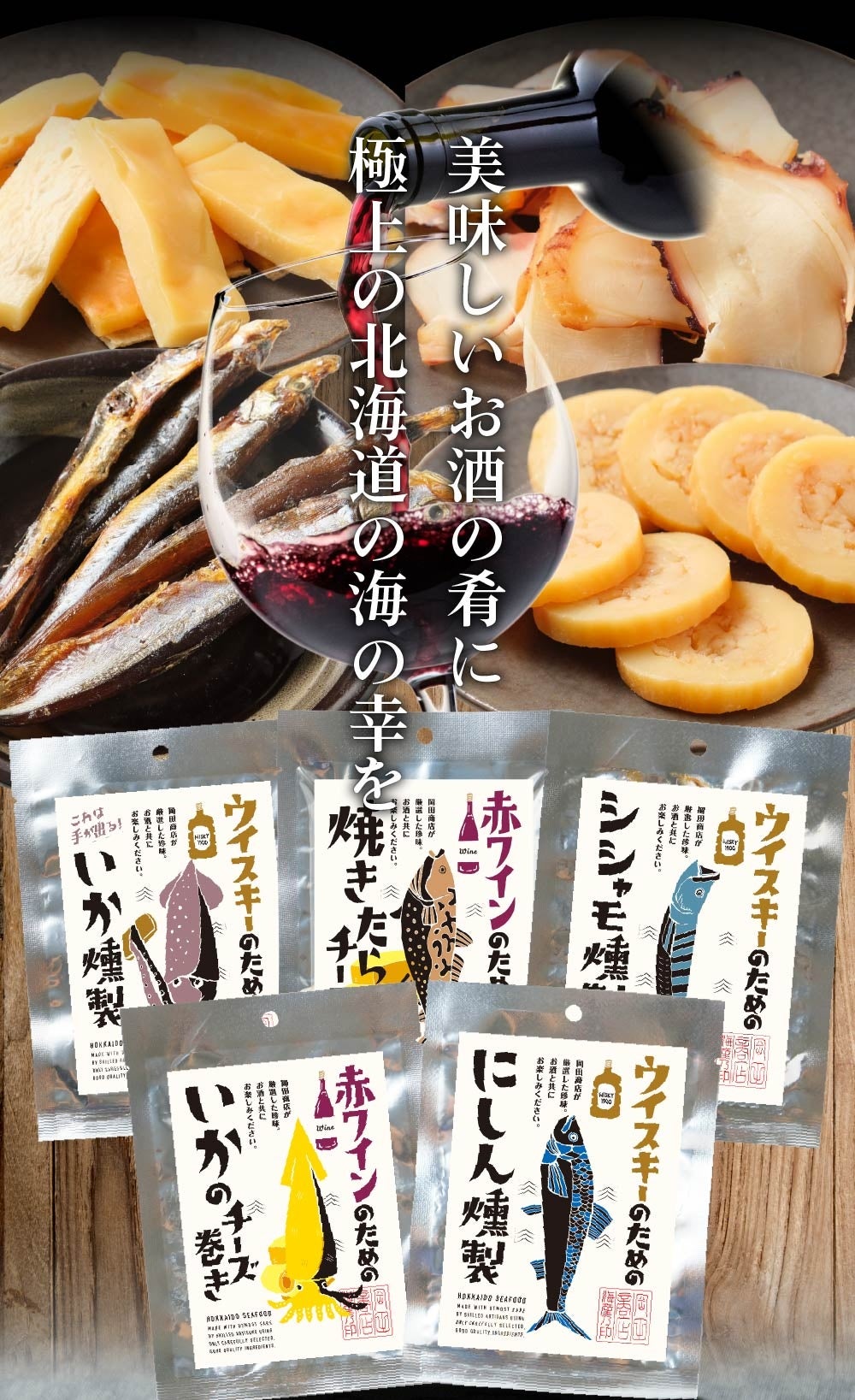 この度販売する【酒のための海のつまみシリーズ第2弾】は、すでに好評発売中の10種のラインナップに加えて「赤ワインのための海のつまみ2種」と「ウイスキーのための海のつまみ3種」の商品をご用意しました。