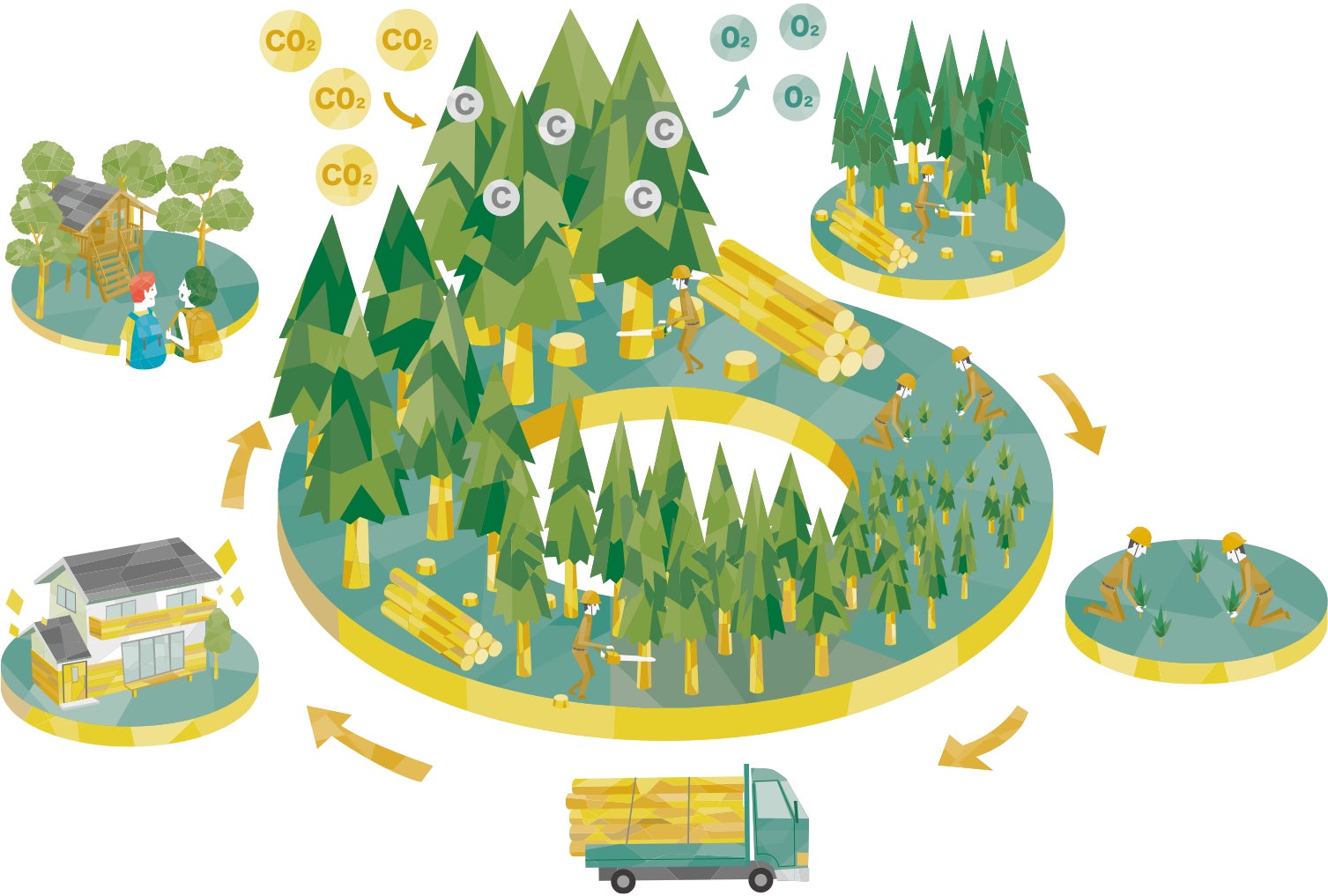 林業の根本的な改革に注力し、木材の資源化を50年にわたり推進してきました。この取り組みは、建築物、家具、おもちゃの製造から端材を利用したバイオマス発電、さらにはカーボンオフセット事業にまで及びます。
