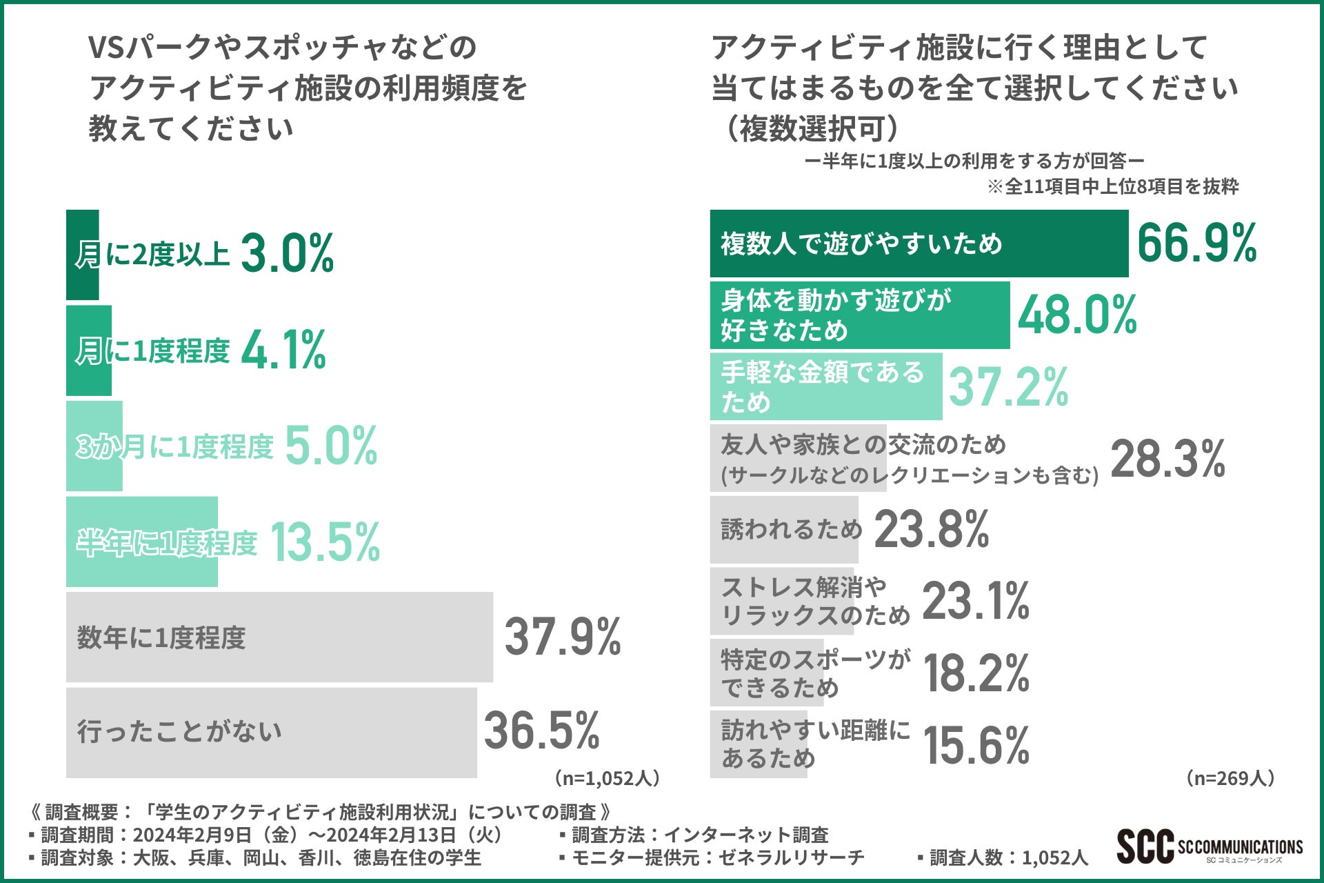 25%の学生が高頻度でアクティビティ施設を利用、利用理由として「複数人で遊びやすい」ことを選択したのは66%