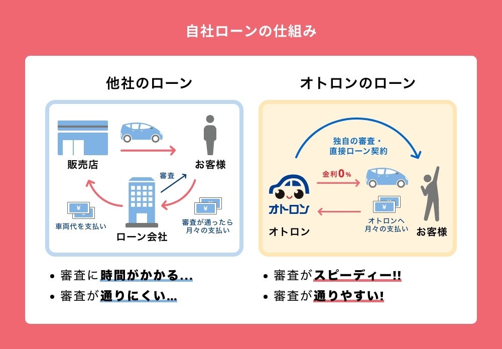 オトロンの「自社ローン」では、信販会社を介さず、当社とお客様との直接契約により分割払い手続きを行います。この仕組みにより、多くのお客様にご利用いただきやすい環境を整えることで、高い審査通過率を実現しております。