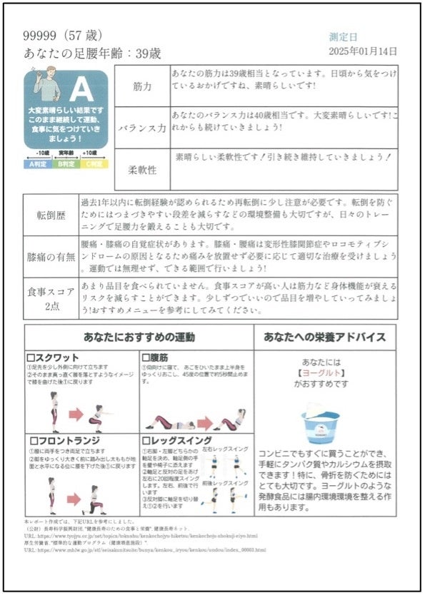 「AYUMI Scan」は、測定から結果取得まで5分程度で完了し、従来の測定方法に比べて手軽であると現場からも高い評価を得ています。さらに、測定結果はWeb上で一括管理できるため、従業員の足腰年齢や転倒リスクを一覧表示し、企業全体での安全対策に活用できます。