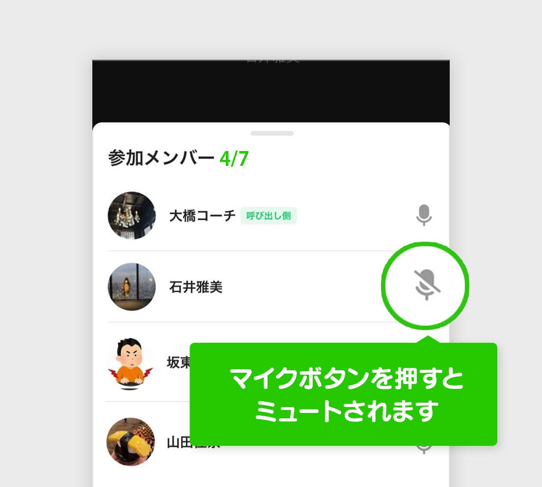 ①「参加メンバーのマイクをミュートする」機能が追加されて、ビデオ通話に不慣れなメンバーがうっかりミュートを忘れてしまった時でもすぐに対応できるようになりました。