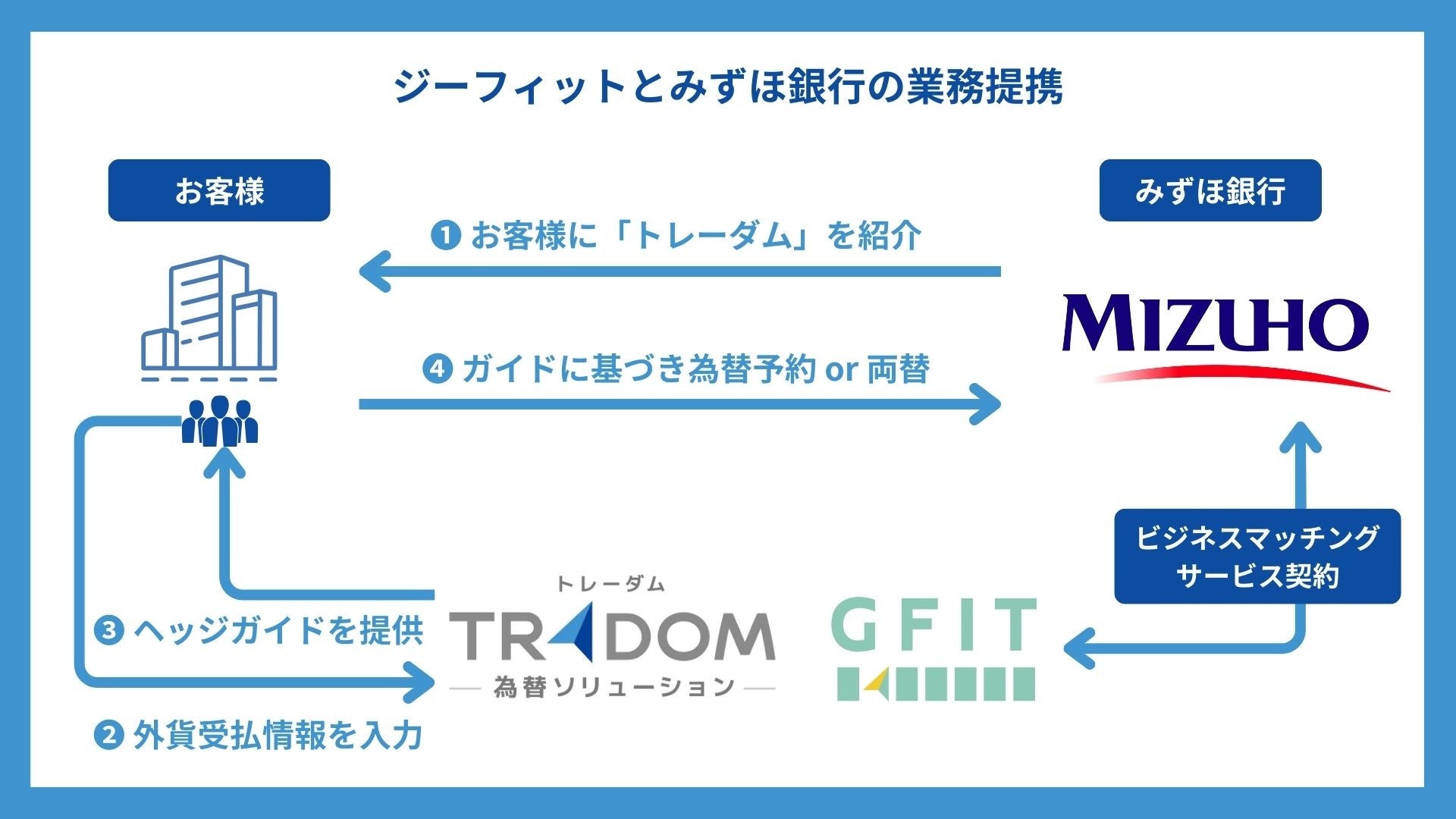 ジーフィット側の背景:為替予約などの為替ヘッジ取引の多くは金融機関が行うため、「トレーダム」のサービスは金融機関との親和性が高く、より多くの企業の為替リスク管理に貢献するために、この度、みずほ銀行との本契約の締結に至りました。