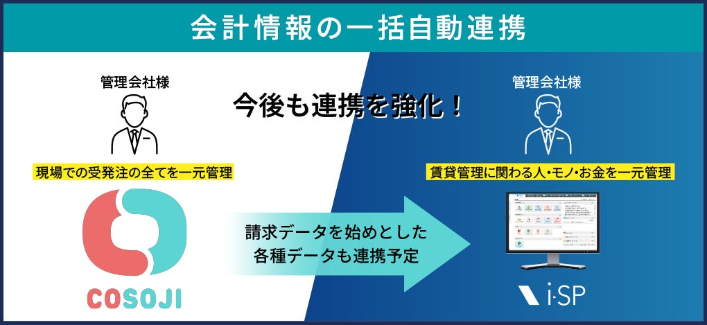 さらなる計画として管理会社様は、既存現場作業者様の取引情報すべてを、COSOJI管理システム上で一元管理できる仕組みを活用し、「請求データなどもi-SPへ連携」する予定です。