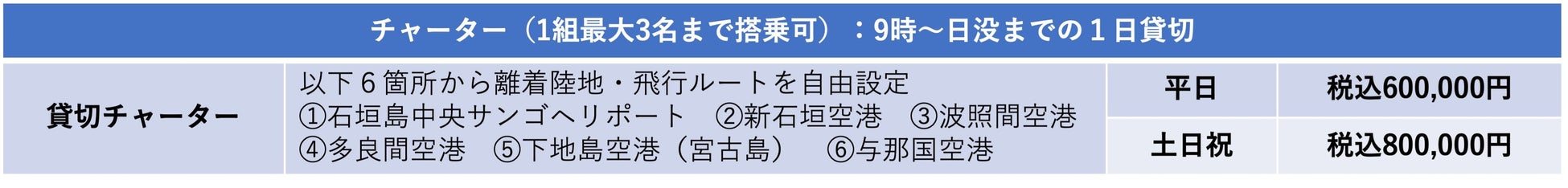 ヘリコプターの民主化を目指すSpace Aviation株式会社(本社:京都市伏見区、読み:スペースアビエーション、代表取締役社長:保田 晃宏)は4月1日(土)より、沖縄県石垣市内に拠点を開設し、ヘリコプターによる遊覧とチャーターの事業を開始いたしました。宮古・八重山諸島の住民および来島者に向けた移動手段と観光コンテンツとして、遊覧商品ブランド『サンゴヘリ™️』を立ち上げ、予約受付を同日付でスタートいたしました。今後は就航地の充実と、移動手段としてのヘリタクシー利活用を目指し、先島諸島各地に離着陸場所を確保する準備を進めてまいります。