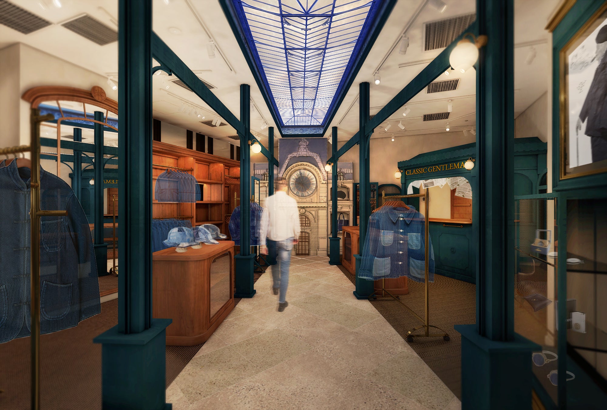 ヨーロッパの駅にあるパサージュをイメージした店内は駅の時計をデザインしたフィッティングルームやキオスクを模したレジカウンターなどを設置。また多くのジェントルマンたちに共通するコレクター的側面を思わせるような、貴重な書籍や蚤の市で買い求めたアンティークや日本画などが店内を飾ります。