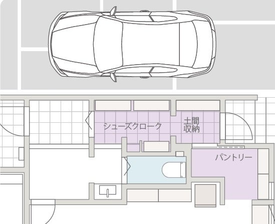 勝手口から荷物の出し入れができ、たったの5歩で冷蔵庫へ到着できる動線。玄関から入るより圧倒的に近いため、共働き家庭が増加する中、家族揃っての買い出しができずとも、1人で荷物運びが苦にならない工夫です。人気の倉庫型大型スーパーなどへのお買い物も、もっと楽しく便利になります。