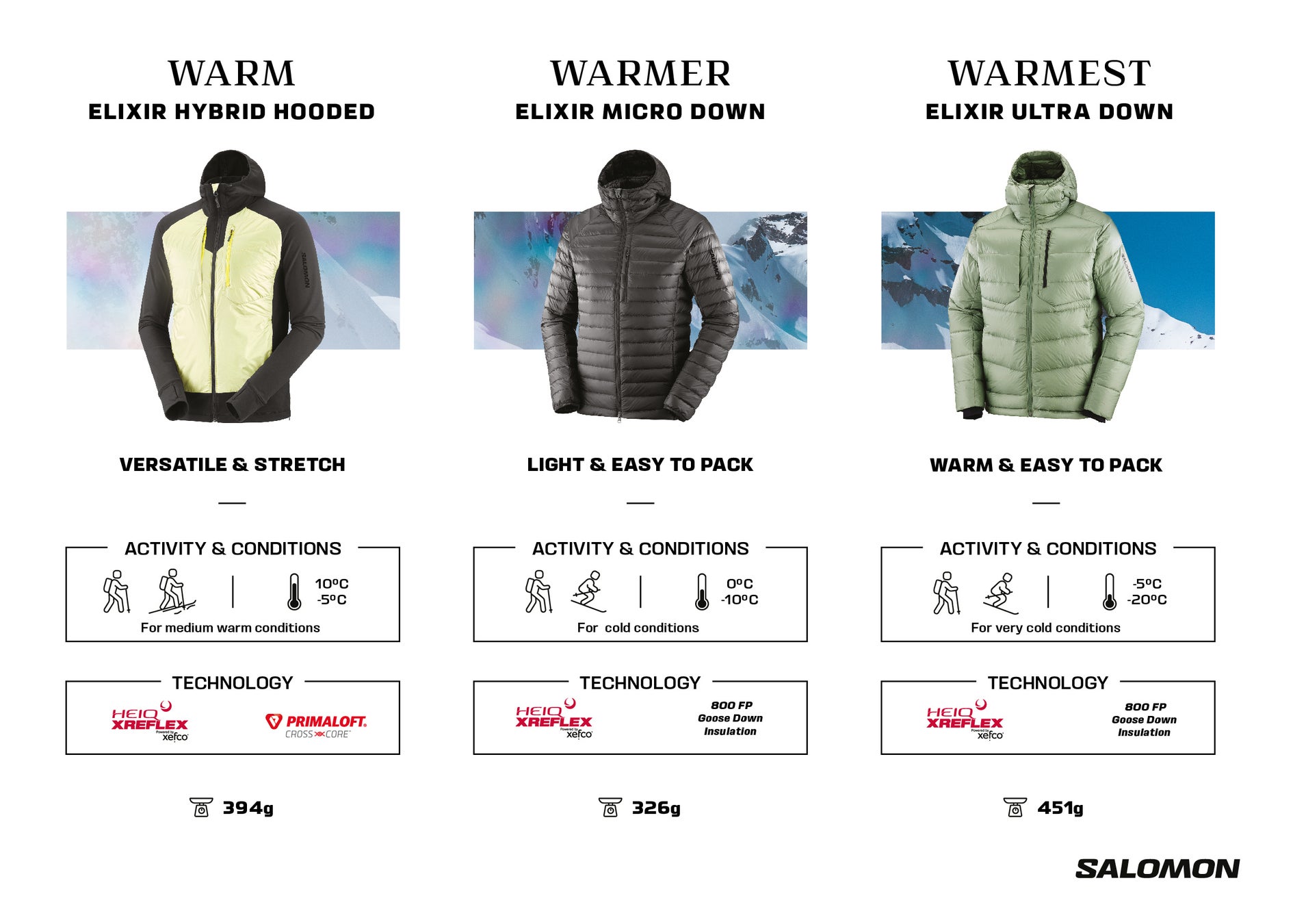 冬山の厳しい寒さを耐え抜く、サロモン史上最も軽く最も暖かい 「ELIXIR」シリーズのアウター3 モデルが発売