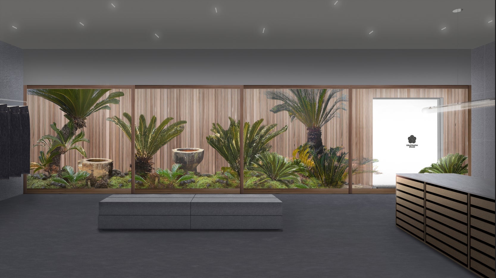 “福岡・大名、国体道路に面する新しい MOMOTARO JEANS FUKUOKA は一見、寡黙な外観をしている。 しかし、そこに穿たれた⼩さな⼊⼝から一歩中に⽴ち⼊ると、このブランドのルーツである瀬⼾内の風景 を思い起こさせる蘇轍(そてつ)の坪庭が現れる。寡黙さの裏に隠されたこの庭は、街の喧騒と落ち着い た店内を隔てるバッファーであり、インテリアへ光と風を届けるためにある。