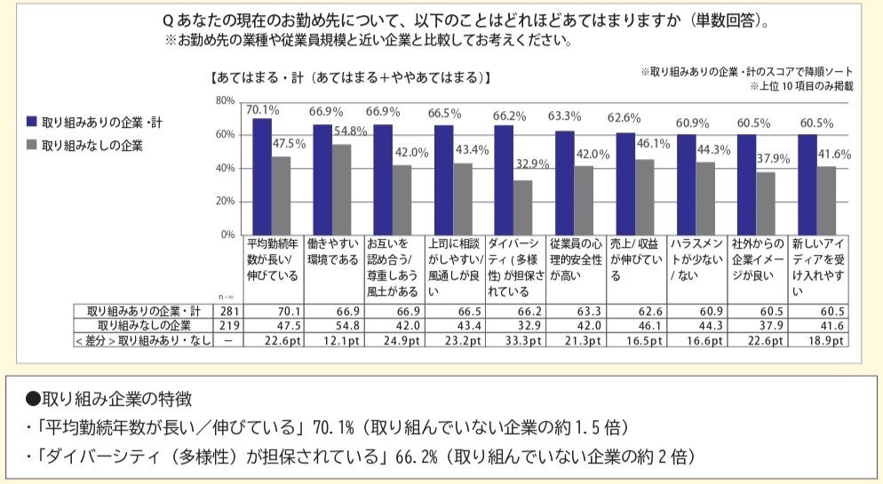 取り組みを実施する企業割合はまだ少ない状況ですが、取り組んでいる企業では心理的安全性が高く、性的マイノリティ当事者である従業員だけではなく、従業員全体の働きやすさ向上にもつながっているようです。