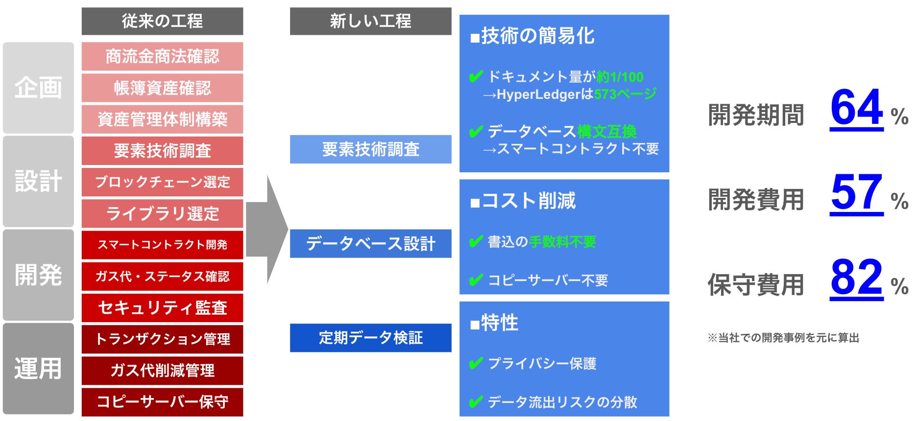 これまでのブロックチェーンプロジェクトでは、技術の複雑さに由来した学習・開発・管理コストをはじめとし、企画段階では、暗号資産の法務および税務の取り扱いや登録情報のプライバシー問題など導入に至るまでに様々な障壁が存在し、プロトタイプの作成やシステムの一部に実験的に組み込むといった第一歩目を踏み出すことが難しいという課題がありました。これらの課題に対し、これまでのスケーリングやプライバシーの研究開発、暗号理論の共同研究で得た知見から同じ機能性を効率性が高く容易に扱うことができる技術に置き換えることで、開発工数とメンテナンスにかかる費用や専門家の人員数を大幅に削減し、スモールスタートを可能にしました。