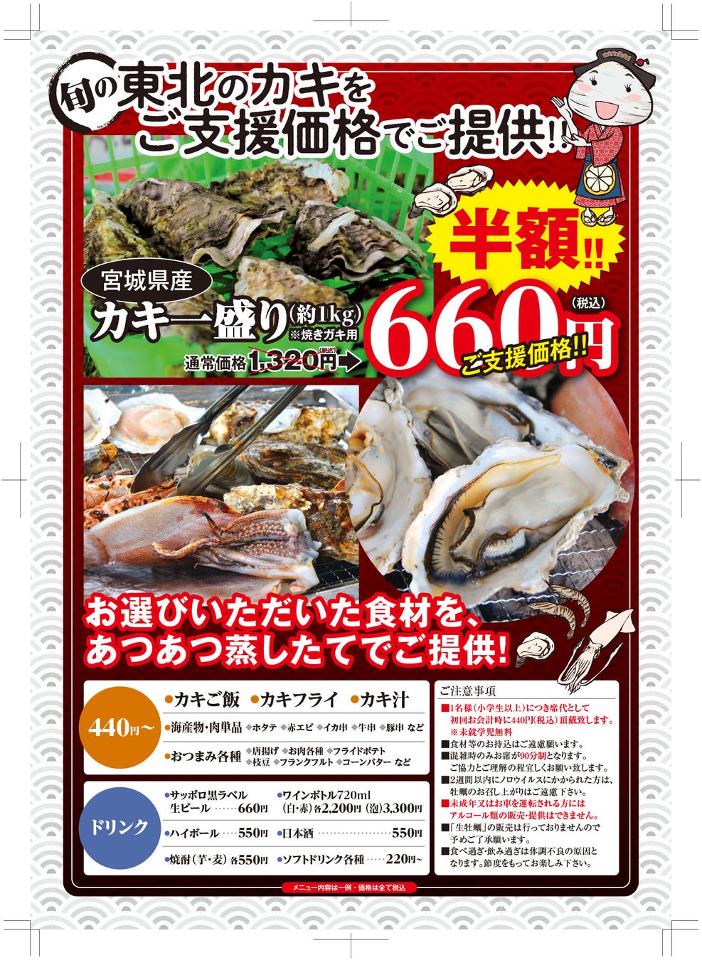 牡蠣は「石巻産殻付き真牡蠣」(約1キロ=殻付き6〜7個)通常1,320円のところ、東北復興支援価格として1盛り660円で提供する。
