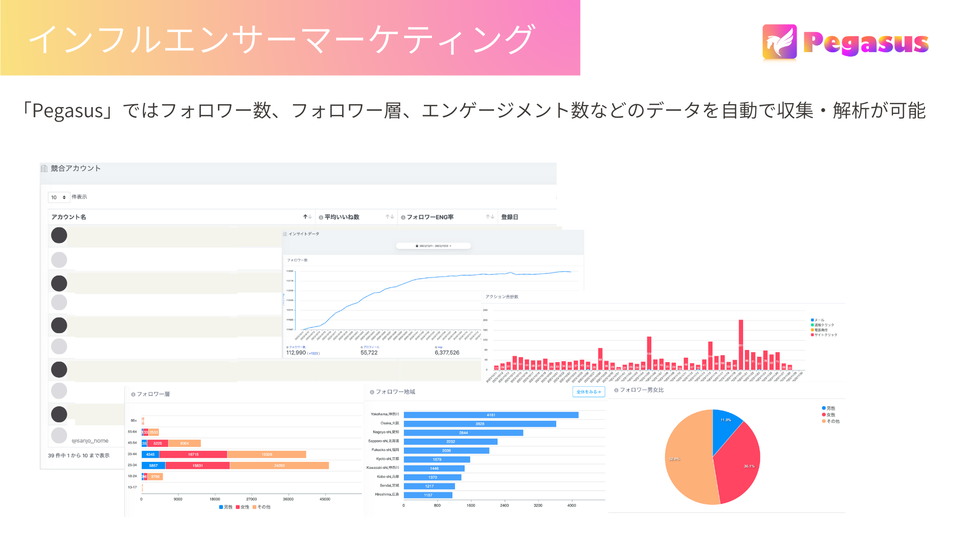 SNS分析ツール「Pegasus」ではInstagramのインフルエンサーマーケティングにおける競合分析に特化した機能としてフォロワー数、視聴者層、エンゲージメント数などのインフルエンサーデータを自動で収集・解析し、効果的な戦略の展開が可能です。