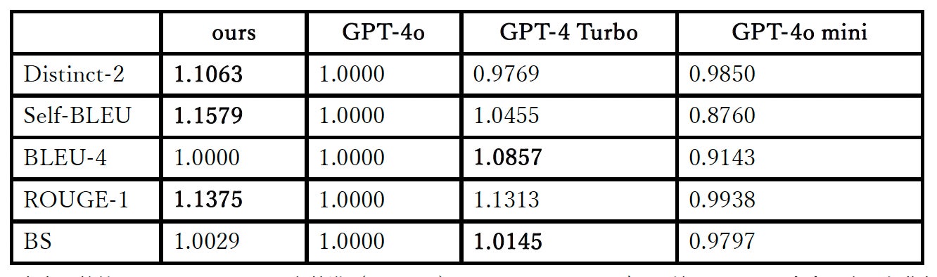 · SELF-BLEU(類似度スコア):生成文同士の類似度を測定