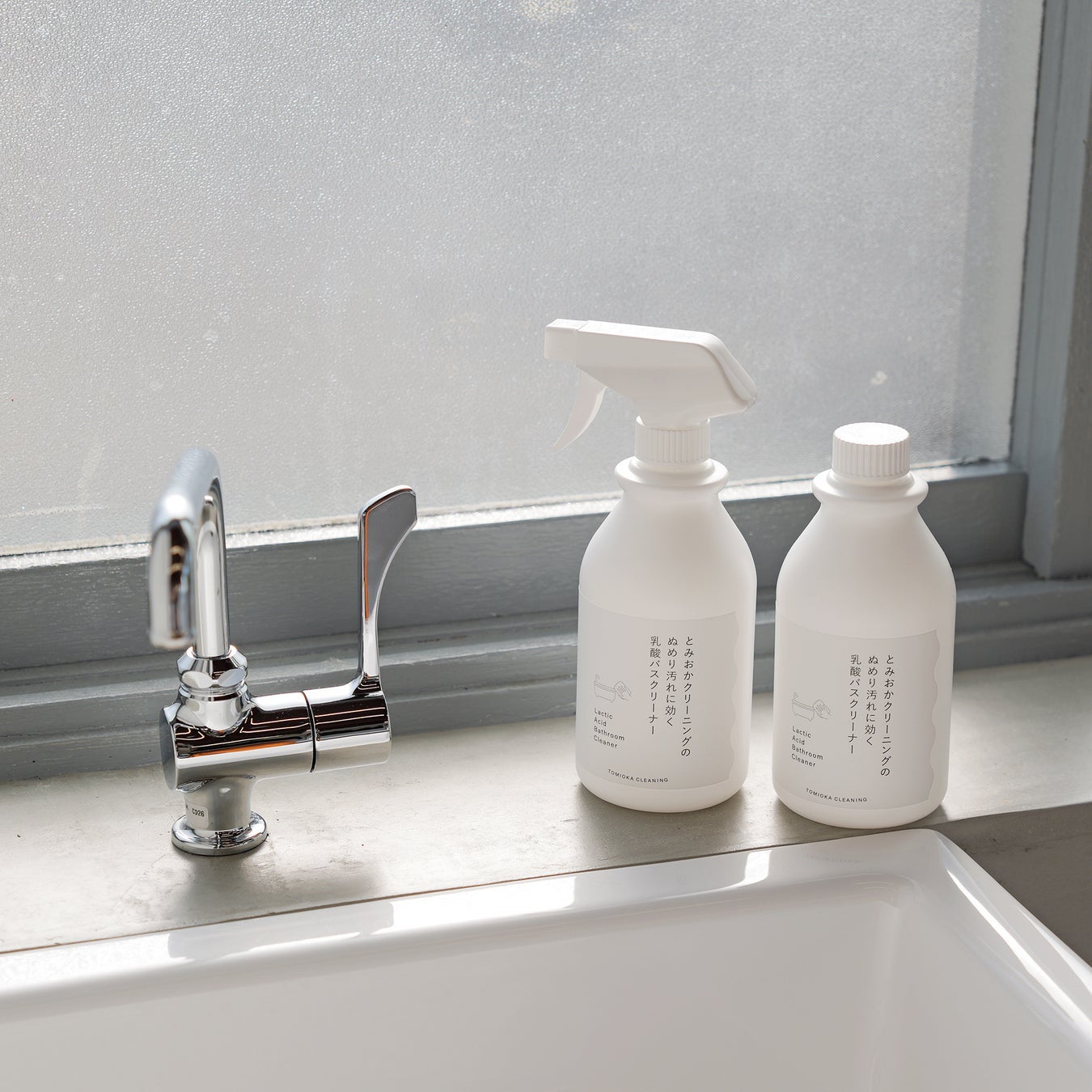 クリーニング店が、洗濯するだけで洗濯槽裏のカビの発生も抑制するオリジナル粉洗剤の効果効能に着想を得て、この度乳酸を配合したバスクリーナーを作った。風呂床や壁の掃除後、特にぬめりが発生しやすい箇所にスプレーして放置、もしくは10分後にすすぐことでいわゆる赤カビが発生しにくくなる。毎日の簡単な掃除で、頑固な黒カビの発生を抑制し風呂場の清潔が持続する。