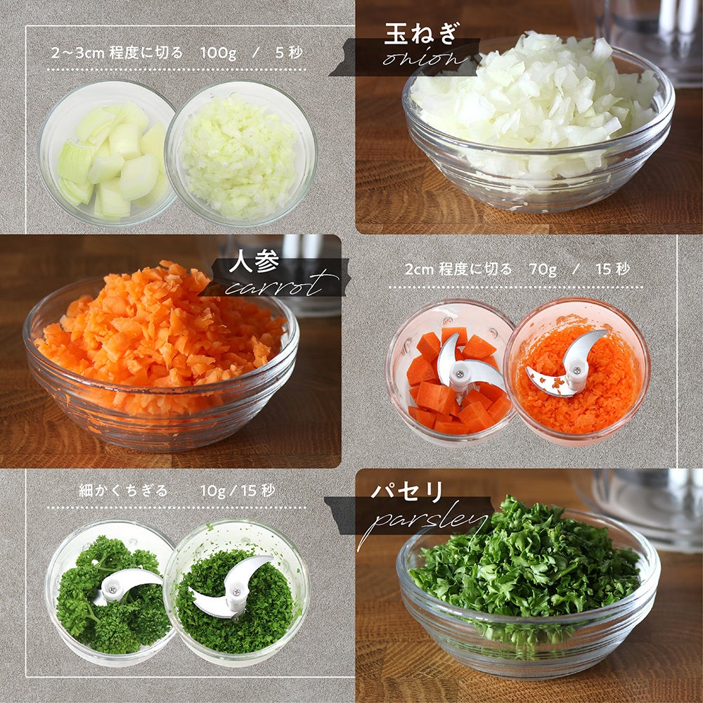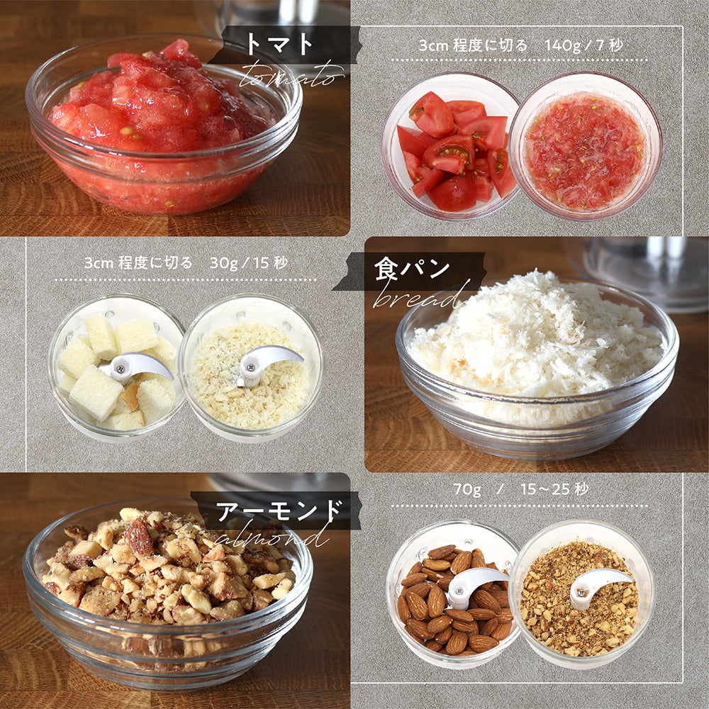 小型ながら3枚刃を搭載し、野菜やパン、ナッツ類などをしっかり刻むことができます。