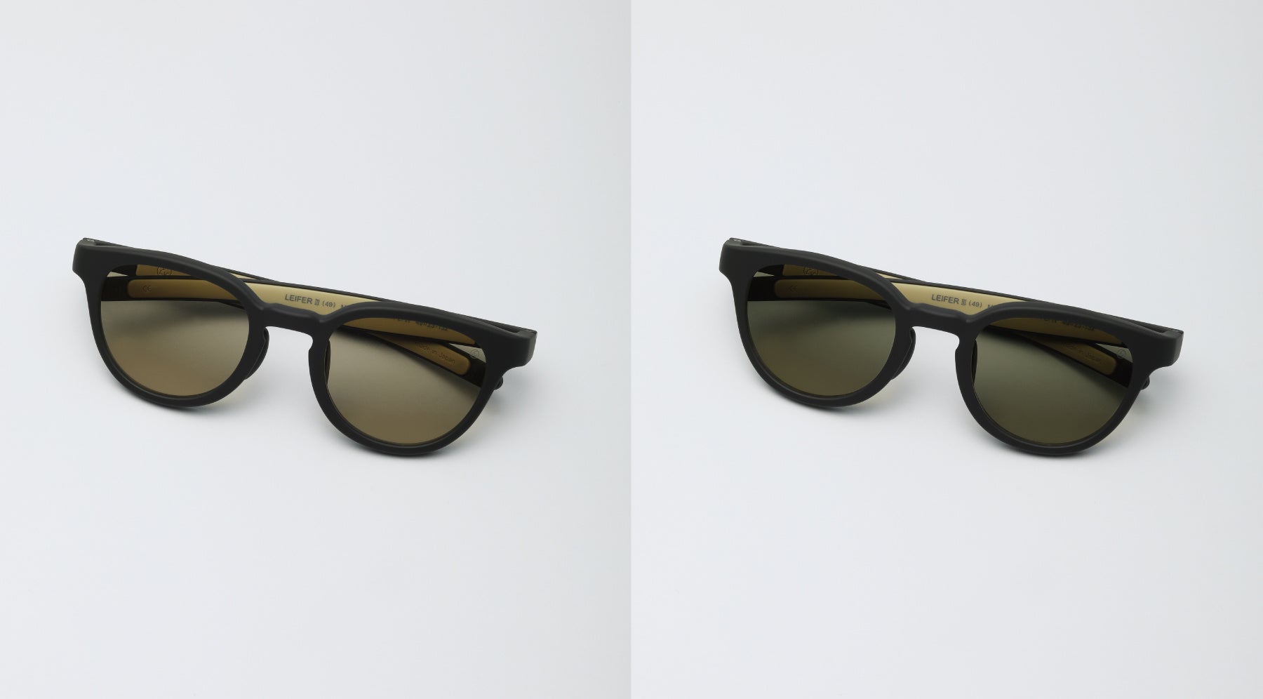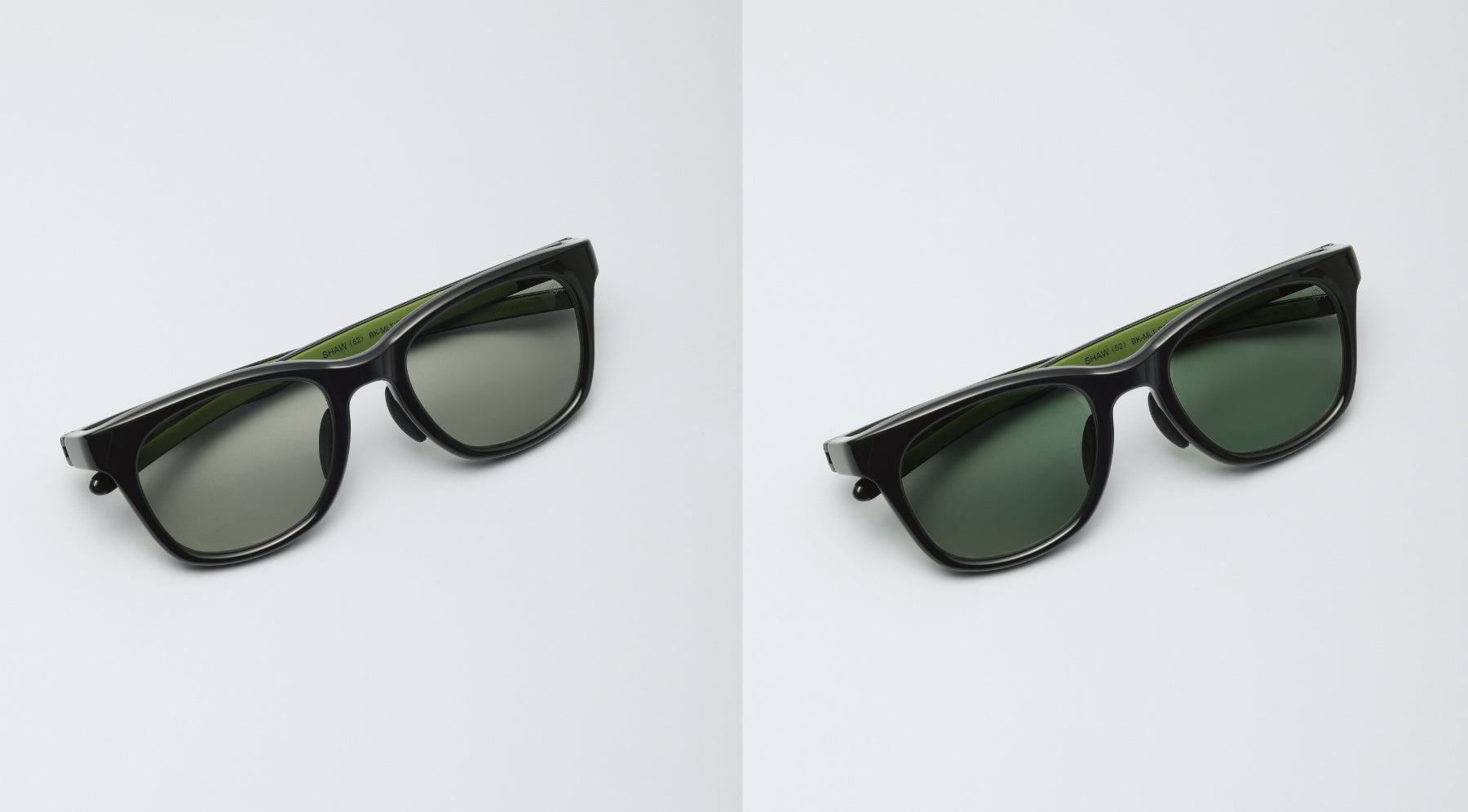 ミディアムブラウンからダークグレーへ、ミディアムグレーからダークグリーンへ。アイコンタクトが取れる濃度のミディアムカラーから、眩しさをしっかり防げるダークカラーへ変化する、別注ならではのレンズカラーです。