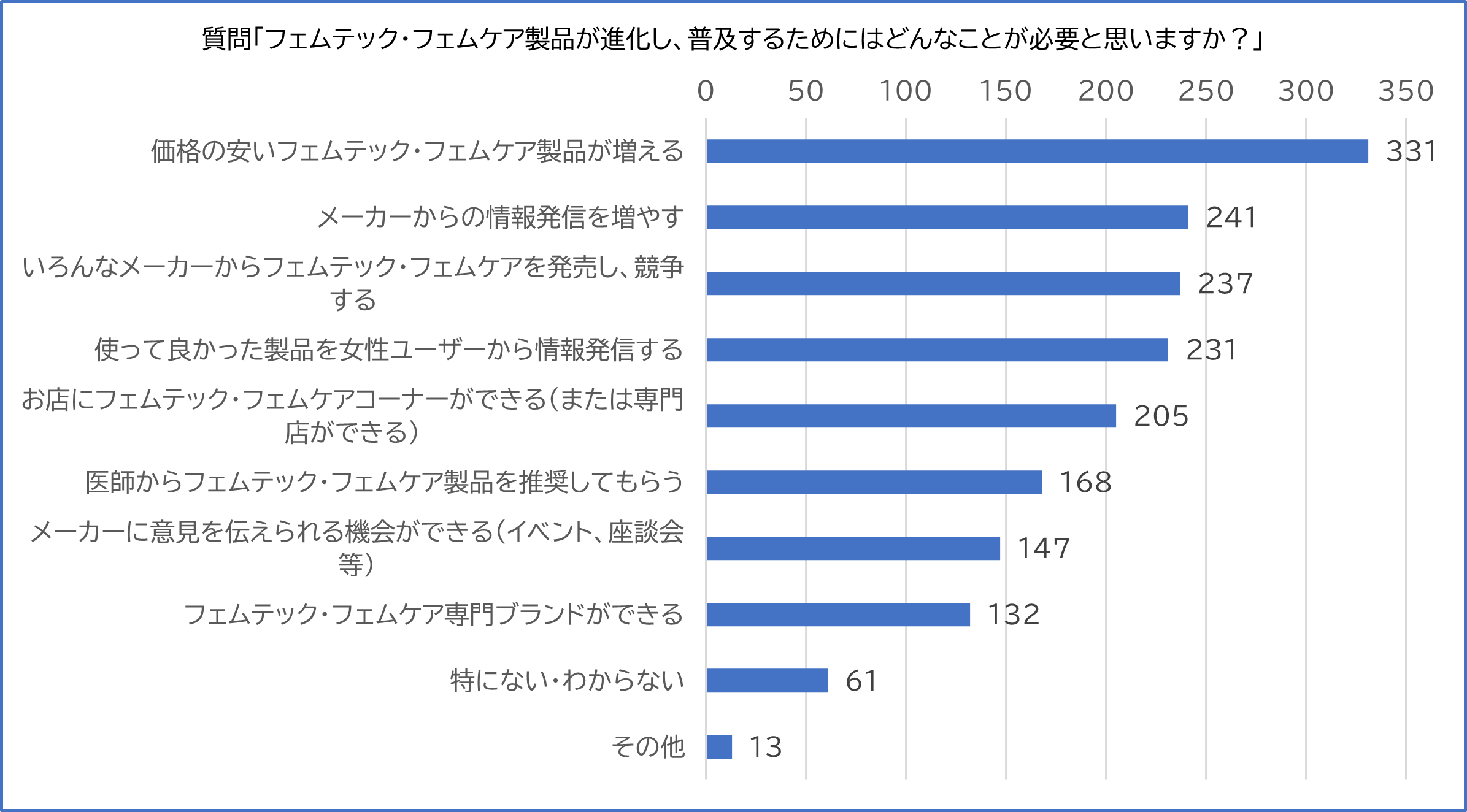 また「フェムテック・フェムケア製品が進化し、普及するためにはどんなことが必要と思いますか?」の問いについては、「価格の安い製品が増える」「メーカーからの情報発信を増やす」「いろんなメーカーからフェムテック・フェムケア製品を発売し競争する」「使って良かった製品を女性ユーザーから情報発信する」というのが上位に挙がりました。