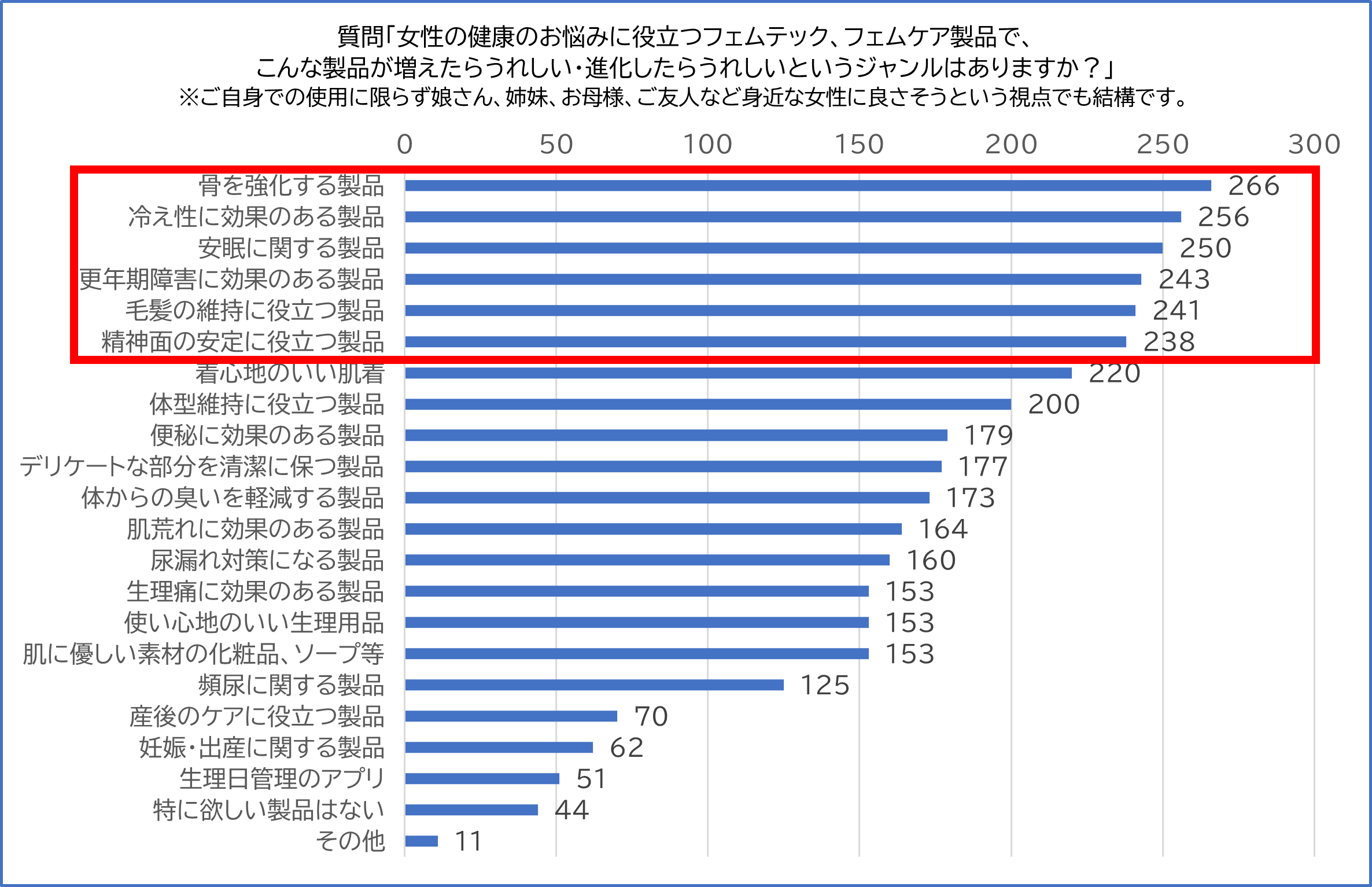 「女性の健康のお悩みに役立つフェムテック、フェムケア製品で、こんな製品が増えたらうれしい・進化したらうれしいというジャンルはありますか?」という質問に対し多かったのは「骨を強化する製品」「冷え症に効果のある製品」「安眠に関する製品」「更年期障害に効果のある製品」「毛髪の維持に役立つ製品」「精神面の安定に役立つ製品」が上位になりました。