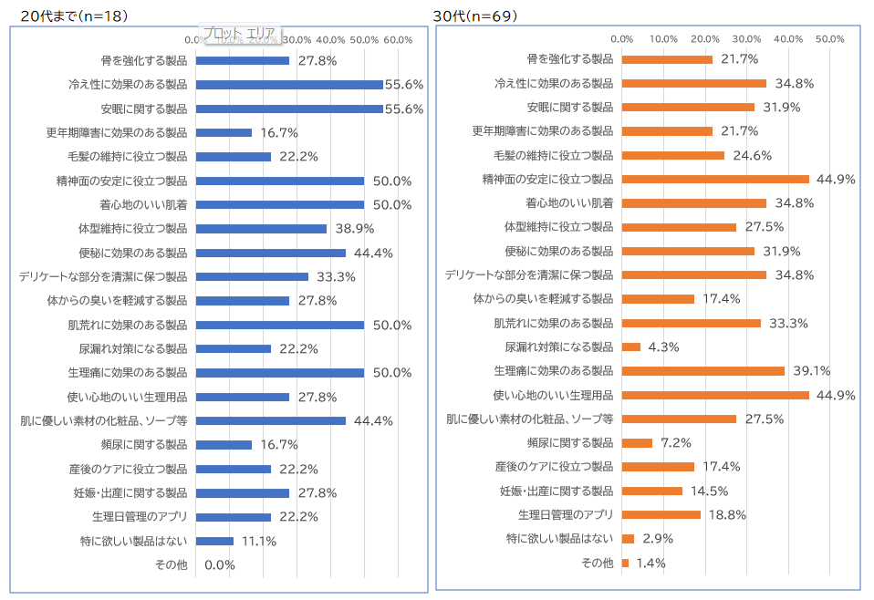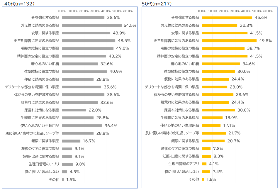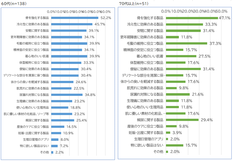 一方で「生理痛に効果のある製品」は30代以下で多く、「更年期障害に効果のある製品」は40、50代で目立ちます。「骨を強化する製品」「「毛髪の維持に役立つ製品」は年代が上がるにつれ多くなる傾向です。