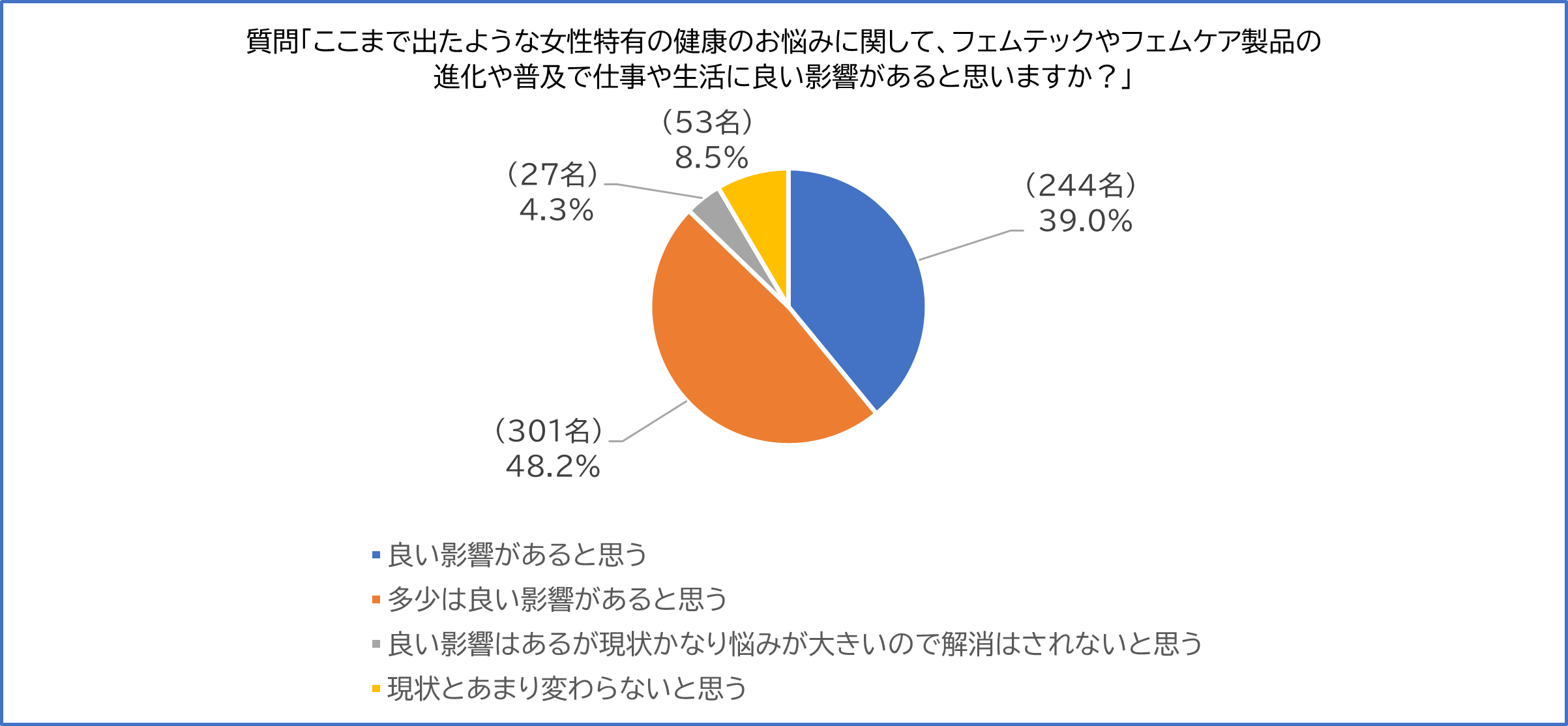 「ここまで出たような女性特有の健康のお悩みに関して、フェムテックやフェムケア製品の進化や普及で仕事や生活に良い影響があると思いますか?」との質問に対し、90%近い方が良い影響があると回答されました。フェムテック・フェムケア製品の普及に対する女性の期待の大きさがうかがえます。