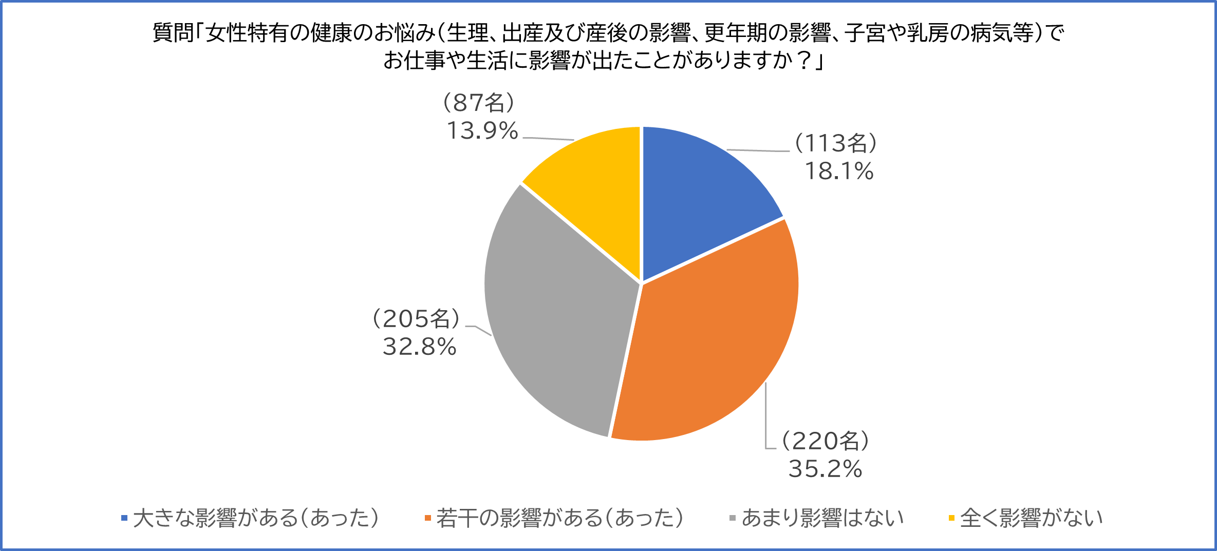 「女性特有の健康のお悩み(生理、出産及び産後の影響、更年期の影響、子宮や乳房の病気等)でお仕事や生活に影響が出たことがありますか?」との質問に対し、過半数の方より影響があったと回答がありました。また、大きな影響があったという方も2割近くおり、お仕事や生活にまで影響のあるお悩みを抱えている女性がいらっしゃいました。