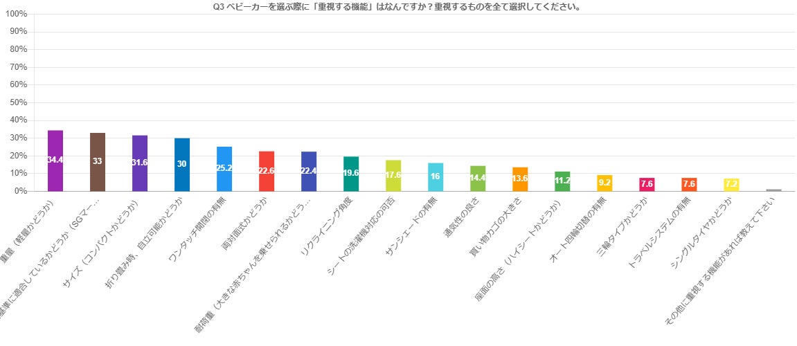 ベビーカーを選ぶ際に重視した機能は「重量」が34.4%と最も多く、次いで「安全基準」33%、「サイズ」が31.6%となりました。