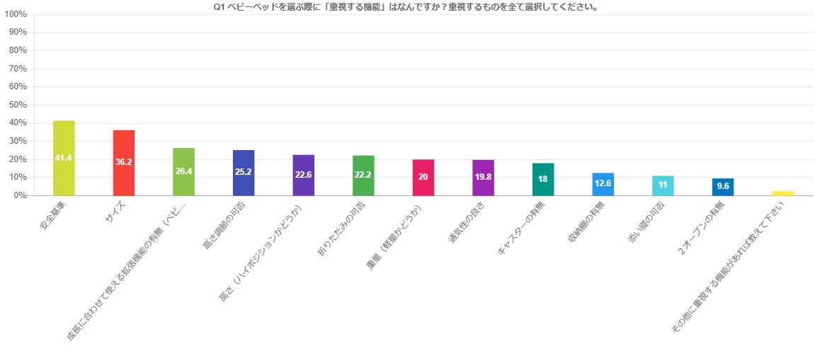 ベビーベッドを選ぶ際に重視した機能は「安全基準」が41.4%と最も多く、次いで「サイズ」36.2%、「成長に合わせて使える拡張機能の有無」が26.4%となりました。
