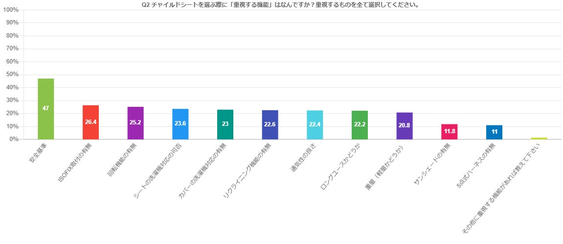チャイルドシートを選ぶ際に重視した機能は「安全基準」が47%と最も多く、次いで「ISOFIX取付の有無」26.4%、「回転機能の有無」が25.2%となりました。