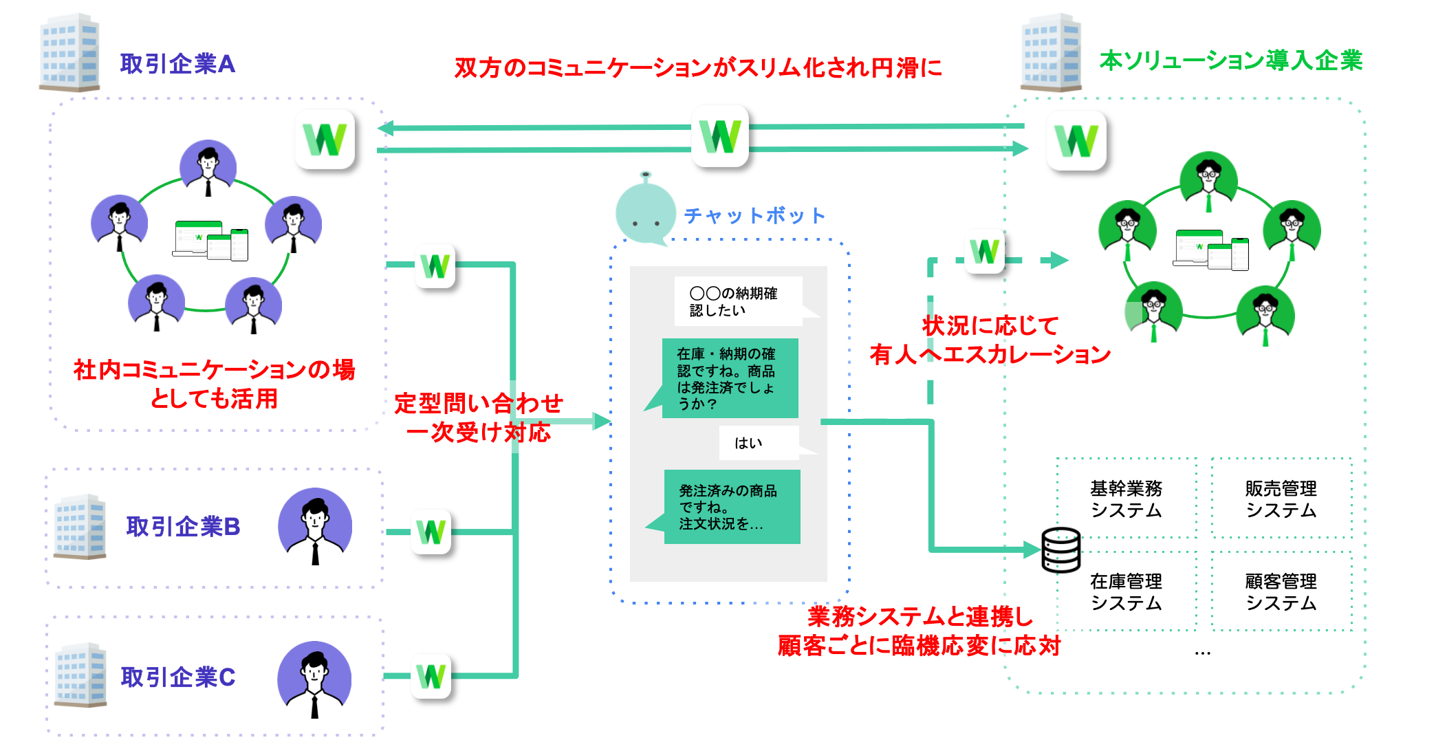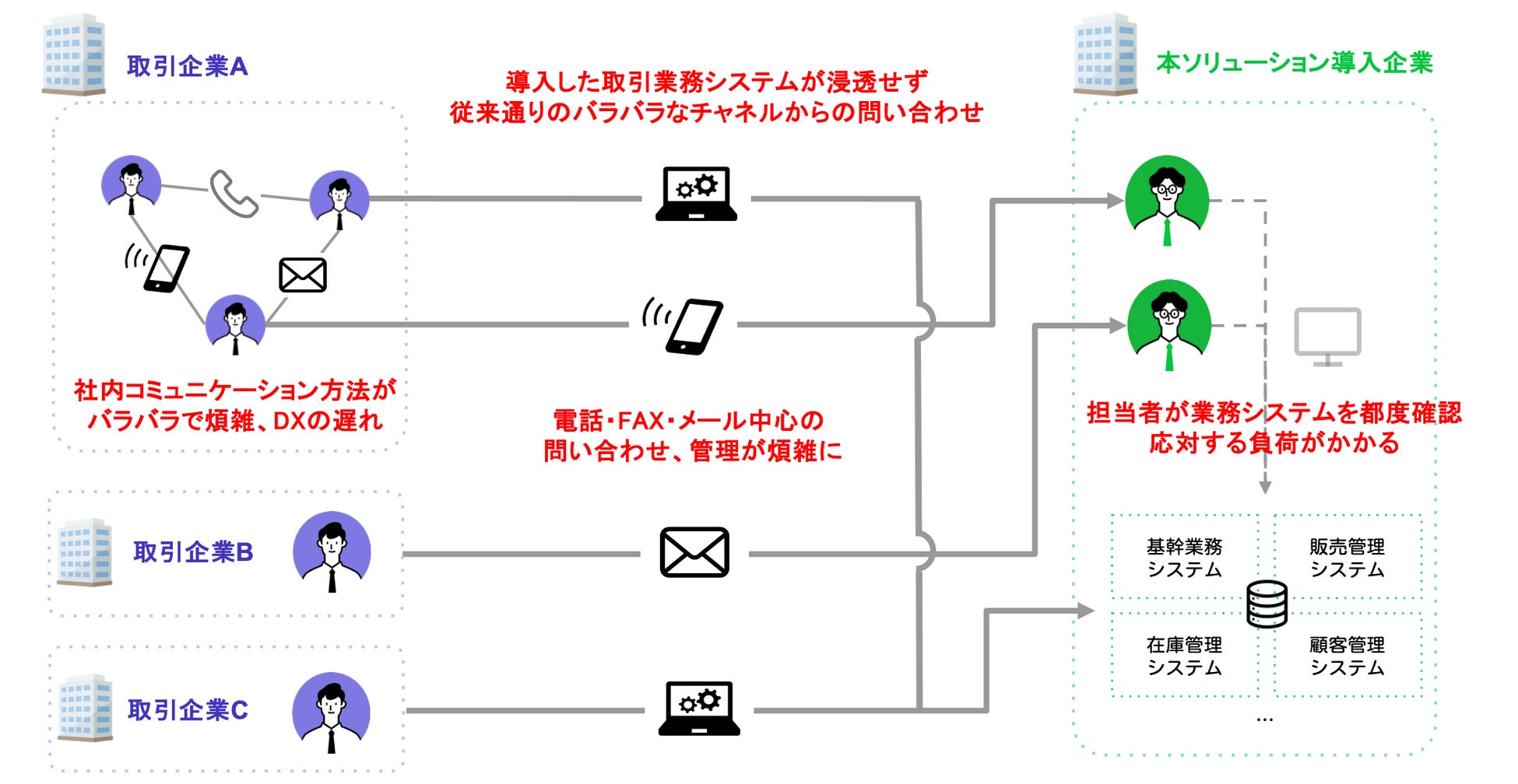 このような両社サービスの良さを活かしたソリューションは、受発注調整や在庫確認など複数の企業にまたがる業務コミュニケーションにおいて、多くの企業が業務システムやデジタルコミュニケーションツールを導入しているものの、取引企業になかなか浸透しないことで生じるコミュニケーションコストや業務効率があがらないといった課題を解決することができます。