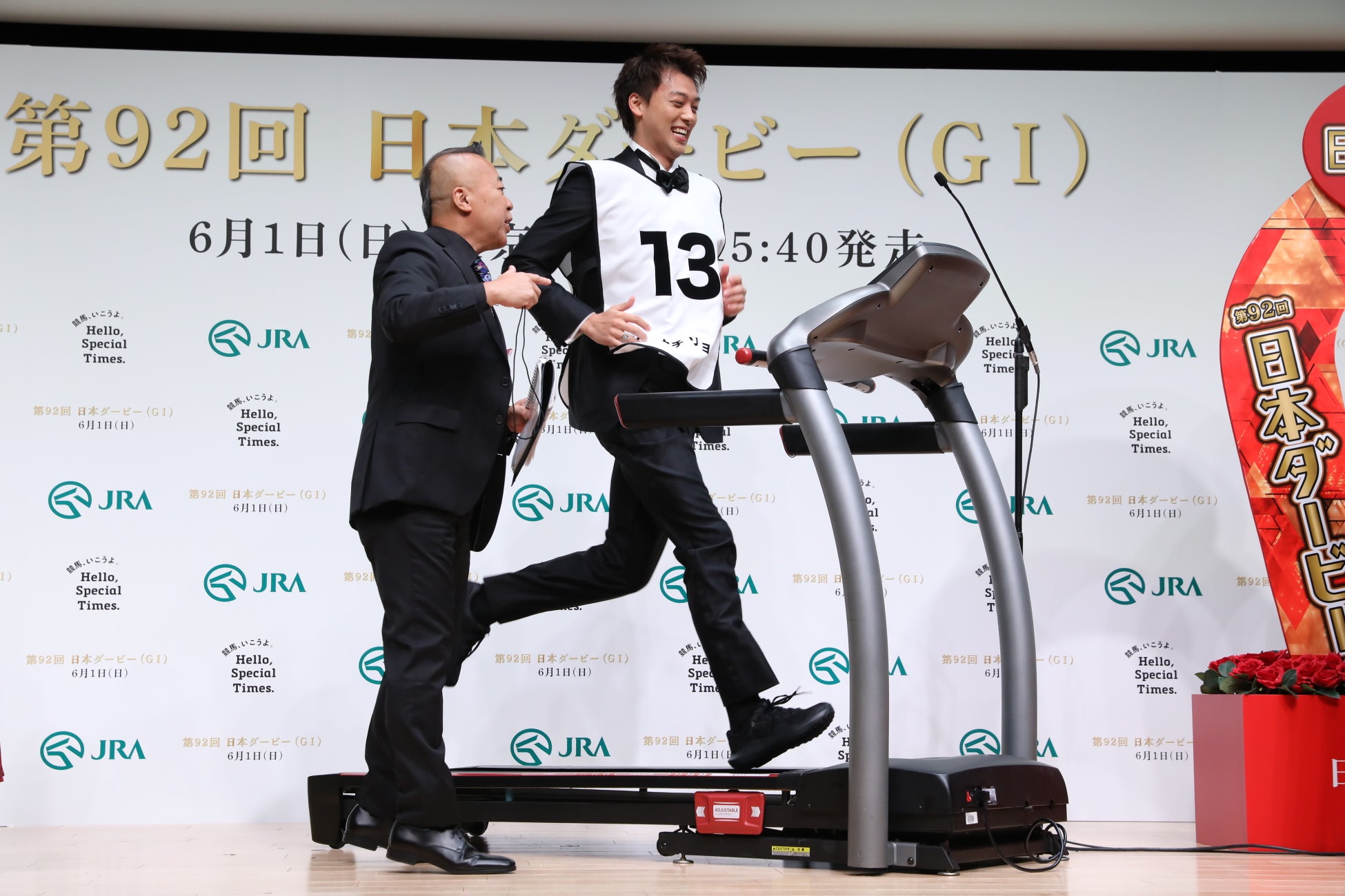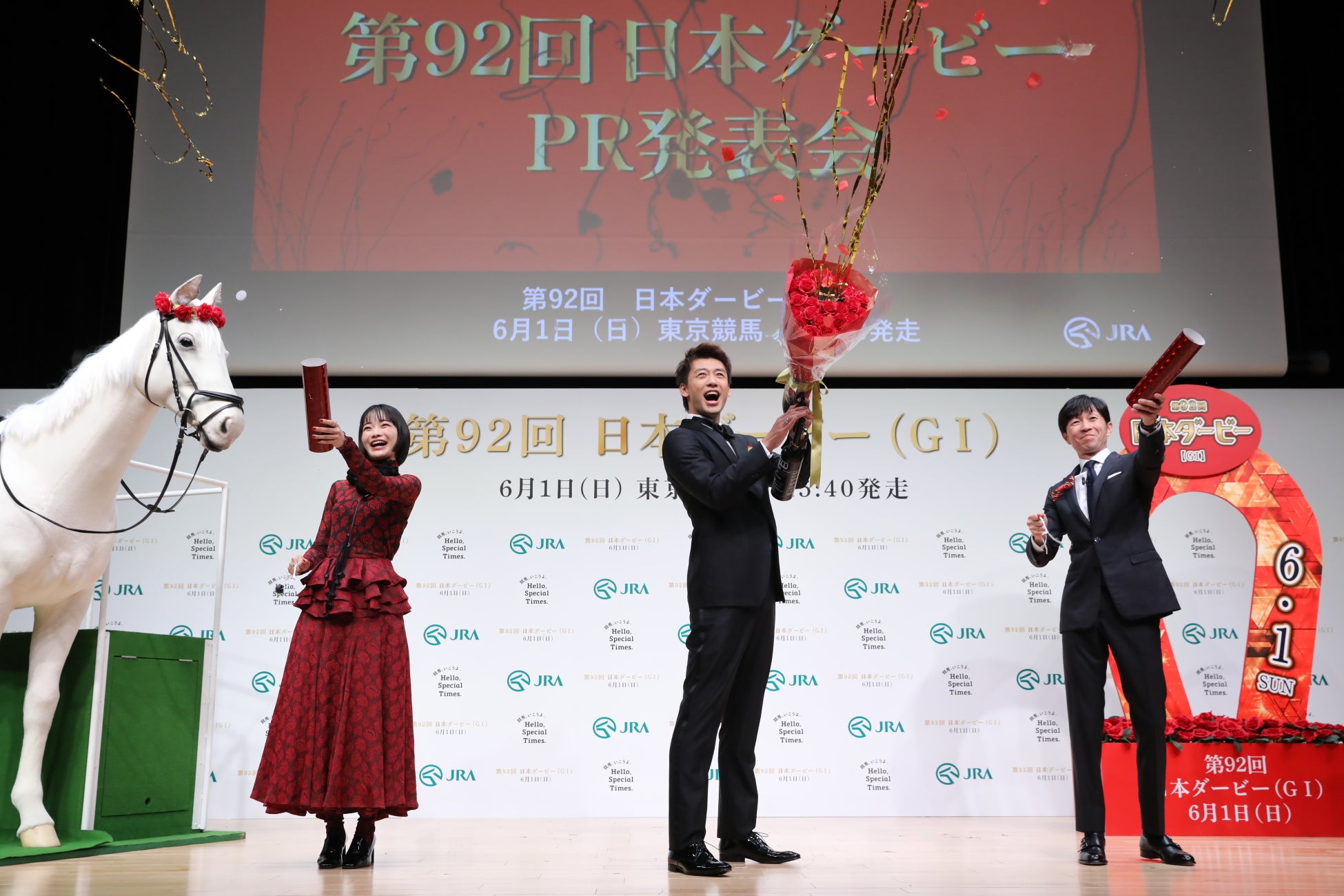 【「第92回 日本ダービーPR発表会」イベントレポート】競馬初心者の竹内涼真さんが、武豊さんの実演指導で騎手体験も!見上愛さんは、日本ダービーを「友達と推し馬活を楽しみたい! 」
