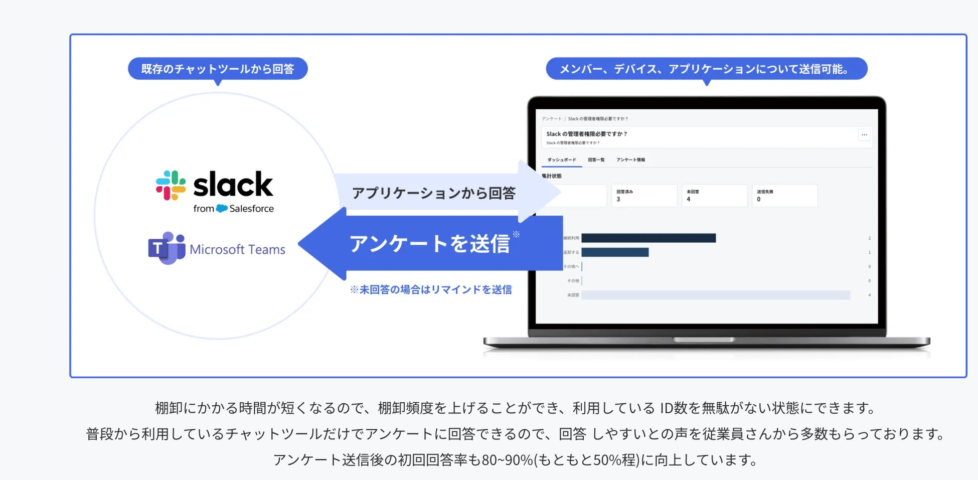 定期棚卸し作業の効率化: 最大の課題であった棚卸しがすごくラクに実現することができました。Slack アプリ上で、従業員が簡単にデバイスの状況を回答できるため、従業員にもフレンドリーだと思います。